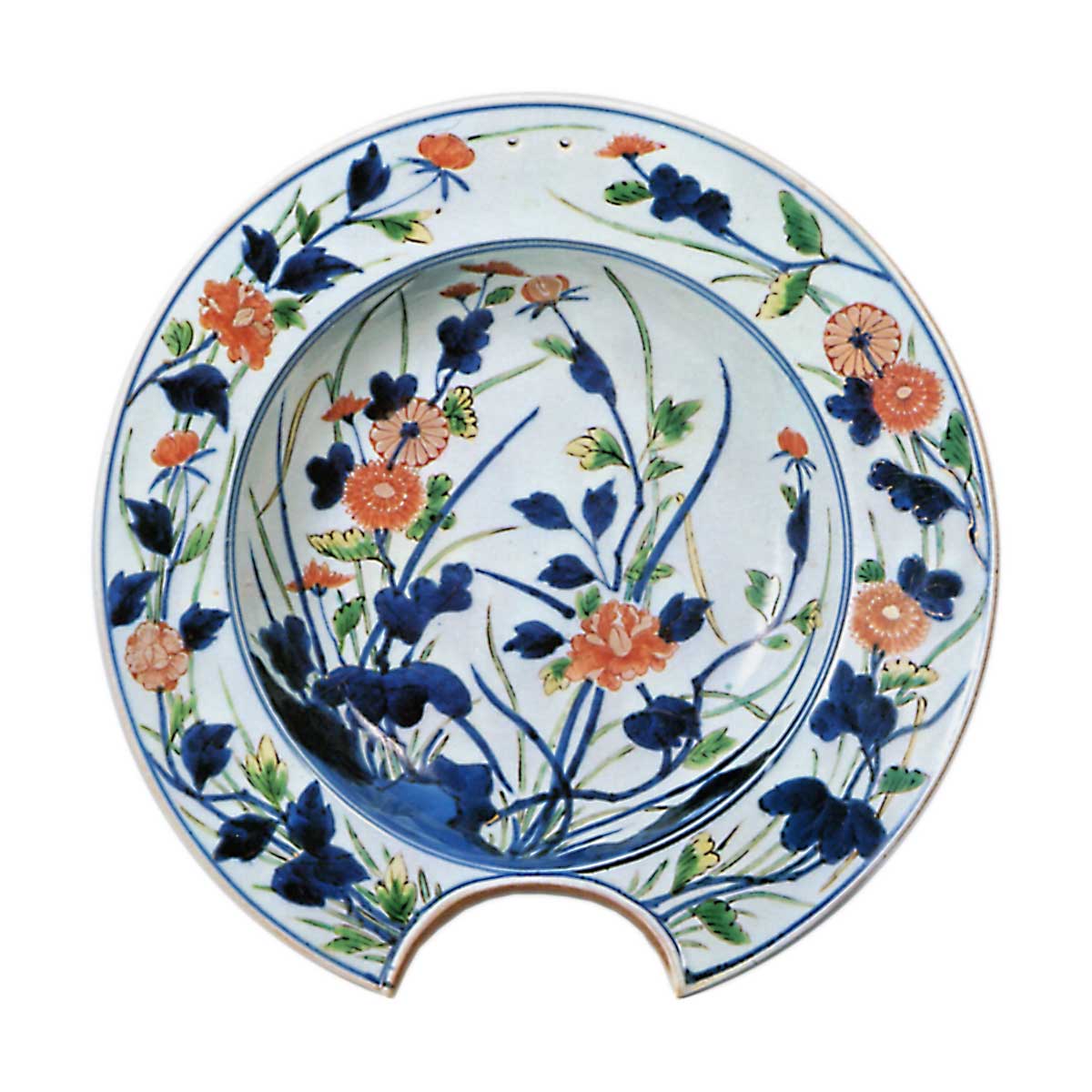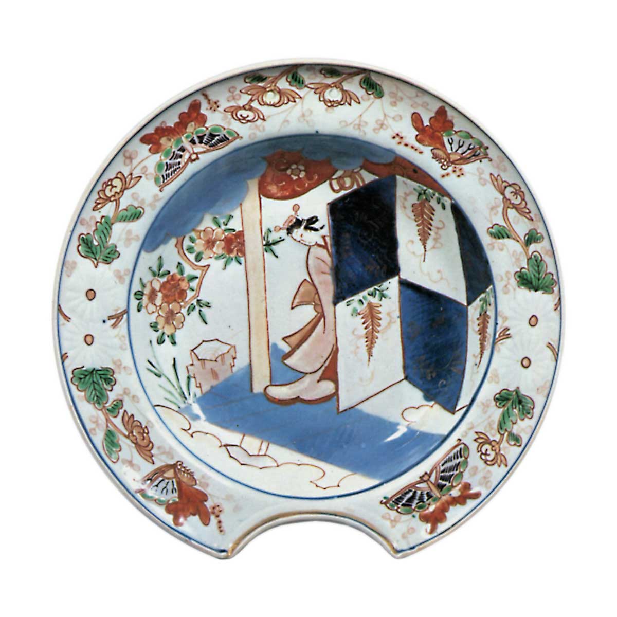 这些俗称胡须盘的器皿,其圆形鐸形盘身搭配半圆形切口的设计,恰似造型盘的形态。色绘牡丹菊纹盘展现了古伊万里特有的表现手法,应与前图属同时期作品。以浓郁的青花釉下彩及红、绿、黄、金彩等色调,生动描绘出牡丹与菊花的纹样。盘底三面饰有石竹等草花折枝纹,高台边缘环绕着梳纹纹样。色绘美人纹盘采用典型的和风纹样:屏风后隐约可见宽文美人,庭院中樱花绽放,薄染青花勾勒的走廊旁置有洗手盆。盘缘以唐草纹样绘制蝴蝶与菊花,在同类髭皿中尤显优雅。背面两侧以青花与彩绘技法描绘折枝梅花纹。