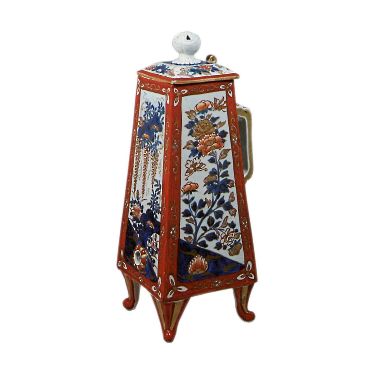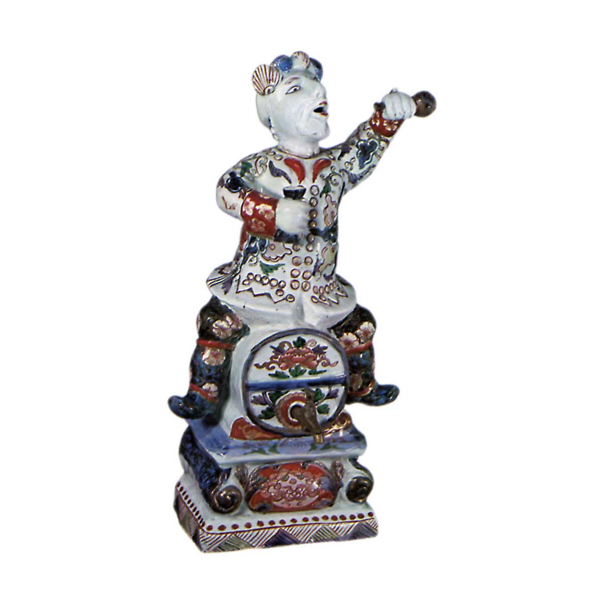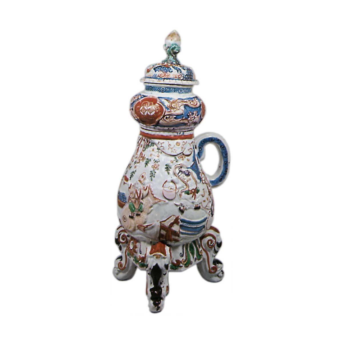 从彩绘人形酒壶到彩绘牡丹纹酒壶的作品,在宽文至元禄时期应欧洲订单制作的出口瓷器中堪称特例。这些皆为盛装葡萄酒的大型瓶器,实为酒桶的替代品——其中人形酒壶作品采用人物跨坐于桶上的器形。就造型而言,其制作手法较之柿右卫门风格的宽文美人人形显得粗放许多——若将前者视为精工之作,此类则属粗犷之作。然而其造型颇具趣味,同类作品实属罕见。色绘七福神纹酒壶的器形明显仿效欧洲金属器皿,但壶身饰纹却绘有和风七福神图案。惠比寿、毘沙门、弁天等神祇乘鲷鱼的图案以浮雕形式呈现,其余面则饰以枝垂樱及各类纹样。盖绳等细节充分体现了对金属器皿的仿效。色绘牡丹纹酒壶为四面方胴的酒樽造型,四面饰有牡丹、藤蔓、山茶、菊花及铁线莲等纹样。青花与朱色浓重,上彩仅用赤色与金彩。应为延宝至元禄年间作品。此二件器物均为近年从欧洲请来的。