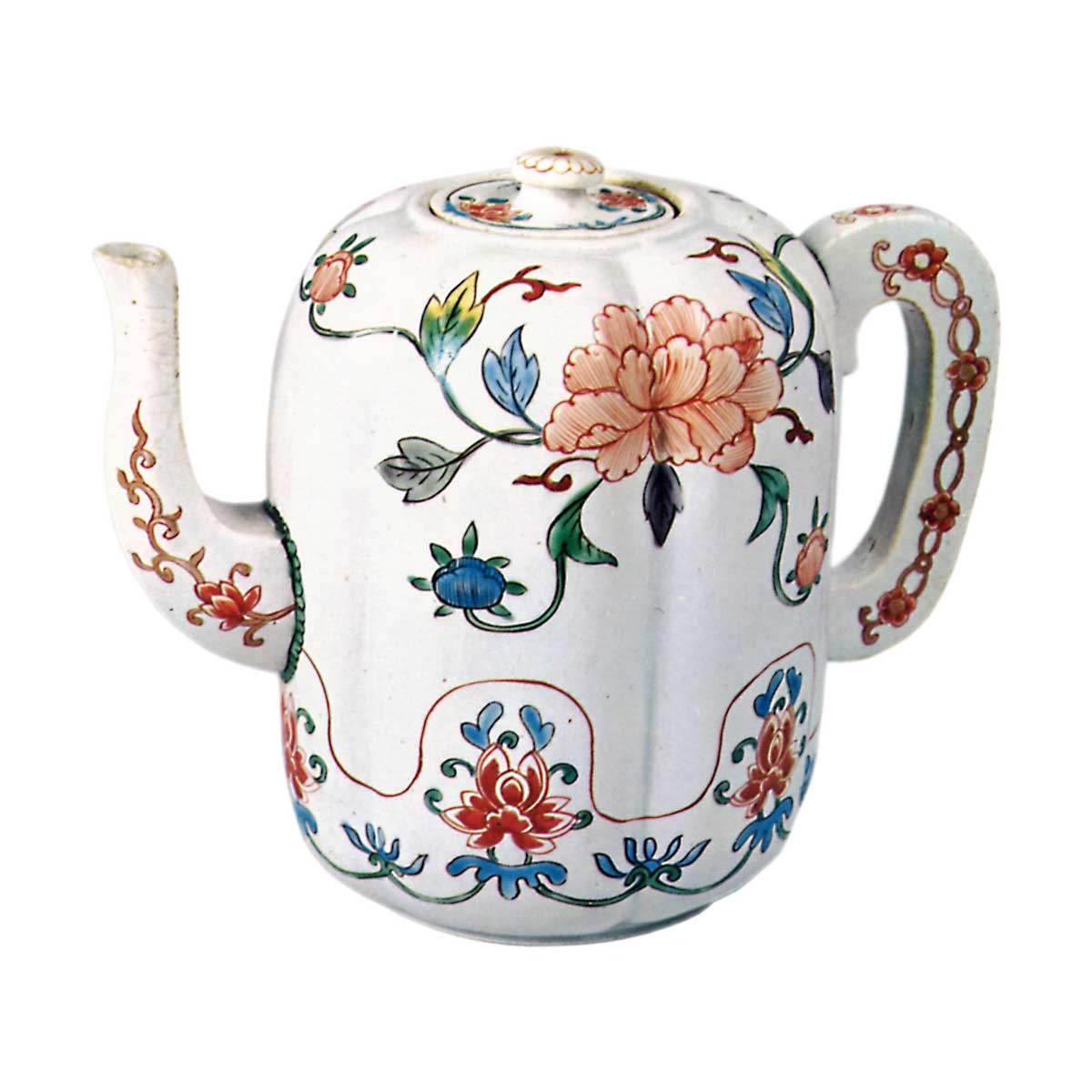 色绘牡丹唐草纹瓜形水注 古伊万里色绘牡丹唐草纹瓜形水注 2025.09.20 色绘牡丹唐草纹瓜形水注 高15.7厘米 口径5.8厘米 左右18.9厘米 底径8.1厘米此为瓜形水注,左右两侧配有宽大的注口与把手。作为伊万里作品实属特殊类型,实为外销品,近年从欧洲购得。素白釉面上以唐草纹样描绘牡丹,并施以红、绿、黄、青、紫五彩上绘。按日本分类体系,此类器物应归为柿右卫门风格,然其本质仍属古伊万里之列。