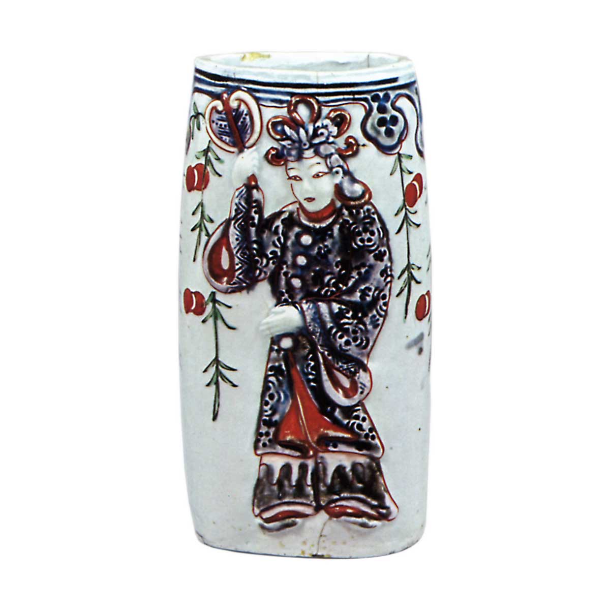 色绘美人纹四方挂花生 古伊万里色绘美人纹四方挂花生 2025.09.20 色绘美人纹四方挂花生 高19.1厘米方形花生器,器底饰樱花透纹,故底部呈显著抬高状。器身绘有鲜艳的美女图,此类作品被誉为柿右卫门风格的杰作,在欧洲亦极为罕见。