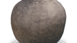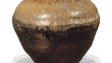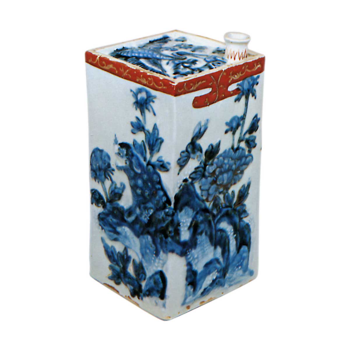 色绘狮子牡丹纹角形酒壶 古伊万里色绘狮子牡丹纹角形酒壶 2025.09.20 色绘狮子牡丹纹角形酒壶 高19.2厘米 壶身直径9.1×9.5厘米 底径9.1×9.2厘米此为伊万里特有的角形酒壶,壶身饰有岩石牡丹、岩石唐狮等纹样,壶盖以浮雕技法呈现云鹤纹,在青花釉底上施以金彩上绘。壶口边缘以红色绘制如薄雾般的纹样,其间描绘唐草纹。底足露胎,可见布纹肌理。