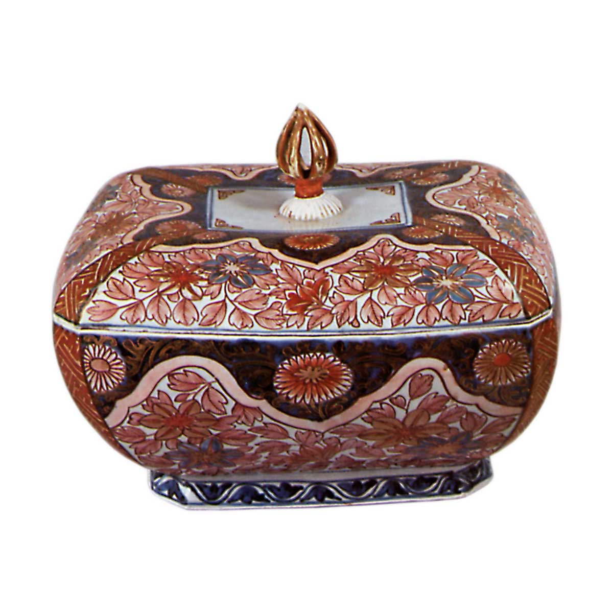 色绘菊铁线莲纹四方盖物 古伊万里色绘菊铁线莲纹四方盖物 2025.09.20 色绘菊铁线莲纹四方盖物 通盖高14.0厘米 身高11.3厘米 口径21.0×25.7厘米 底径14.0×18.5厘米此亦属外销瓷器之一,器形明显契合欧美审美。其造型应仿自银器等器物。器身四面饰以菊花与唐草风格的铁线莲纹样,于青花底上施以红、金、蓝、黄四色上彩。推测为特殊定制之作。
