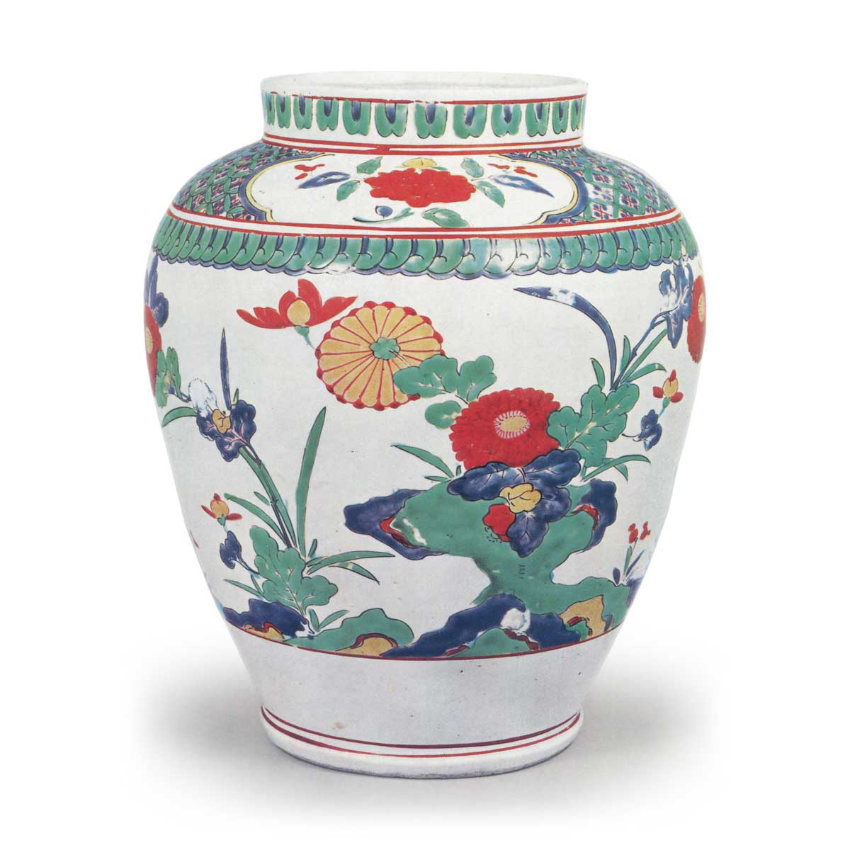 此壶更在壶身呈现以太湖石为中心、两侧环绕菊花的主体纹样,以及以岩石为底衬点缀草花的背纹设计。此构图虽受中国南京赤绘影响,却已和风化为柿右卫门样式的独特布局。以太湖石为中心,左右延伸花枝环绕圆形壶身的样式,虽是元禄时代前柿右卫门色绘瓷器的典型表现手法,但如本壶这般以粗犷舒展笔触呈现的图案,应属稍早时期的作例。壶肩三面开镂格栅式窗棂,饰以牡丹折枝纹;底纹铺满七宝衔接纹,肩下环绕蕨叶状纹样。乳白手柿右卫门风格的沉香壶存世颇多,然鲜有此等艳丽之作。高台叠付处留有砂目痕迹。
