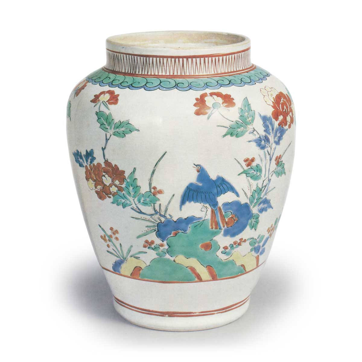 色绘花鸟纹八角壶 日本色绘花鸟纹八角壶 2025.09.21 色绘花鸟纹八角壶 高20.8厘米口径10.6厘米 底径9.9厘米此壶身呈八角锥形,同类器物罕见。白釉胎体遍布细密釉裂纹,呈现柔和质感的素胎质地。壶身两侧分别以太湖石为中心,左右舒展地描绘牡丹纹样,太湖石上配以飞鸟——一侧展翅高飞,另一侧则半蜷伏地。作为乳白釉柿右卫门风格的器物,此作的彩绘色泽尤为鲜明,青色颜料的明度与通透感尤为突出。但相较图5所示器物,其骨描笔触稍显纤细,推测制作年代可能稍晚。