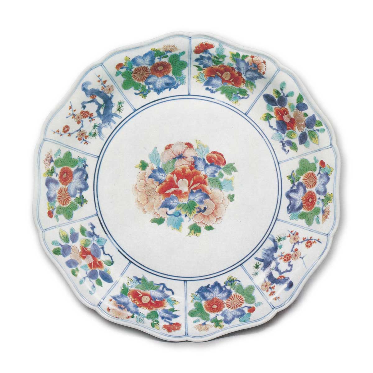 此为口沿呈十瓣轮花形、盘底平坦的大盘,边缘低矮内卷。盘面中央以浓郁青花线描出清晰的双重圆环,浅立的侧面采用十方割纹饰,其间点缀着梅、菊、牡丹、山茶等花卉纹样。中央呈现束状牡丹花纹,所有枝干茎叶均以青花勾勒,花朵则以赤色、浅赤色及金彩绘制。柿右卫门风格特有的明艳花赤色调尤为优雅,与金彩交相辉映,成就了有别于色锅岛的独特彩绘色调。各区块纹样以柿右卫门式花卉纹为基调,在区隔纹样中展现整体性,隐约可见欧式图案的影响。外圈饰以樱川纹,流水以青花绘制,花朵则以赤色与黄色描绘。胎体为略带青色的顶级白瓷胎,高台内留有六处胎痕。