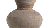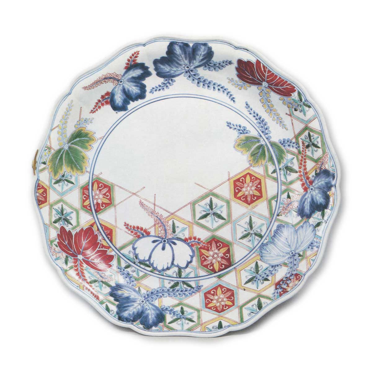 色绘桐龟甲纹大盘 日本色绘桐龟甲纹大盘 2025.09.21 色绘桐龟甲纹大盘 高4.8厘米 口径31.0厘米 底径20.4厘米此盘与色绘花卉纹大盘完全同形,制作年代同样推测为元禄时期。然而其纹样与上彩的红色并非所谓柿右卫门风格,而是以龟甲纹为底衬配以桐树图案,红色彩绘浓郁饱满。整体设计虽近似元禄时期后流行的古伊万里样式,但仍可推测其灵感源自染织纹样。外缘饰纹与彩绘花卉纹大盘相同,环绕樱川纹,高台内蓝釉双圆环中以窑印风格描绘丁香花纹。此类器物仅存二三件,本品曾为有贺长文氏所藏,昭和八年(1933年)被认定为重要美术品。高台内残留八处细小烧痕。