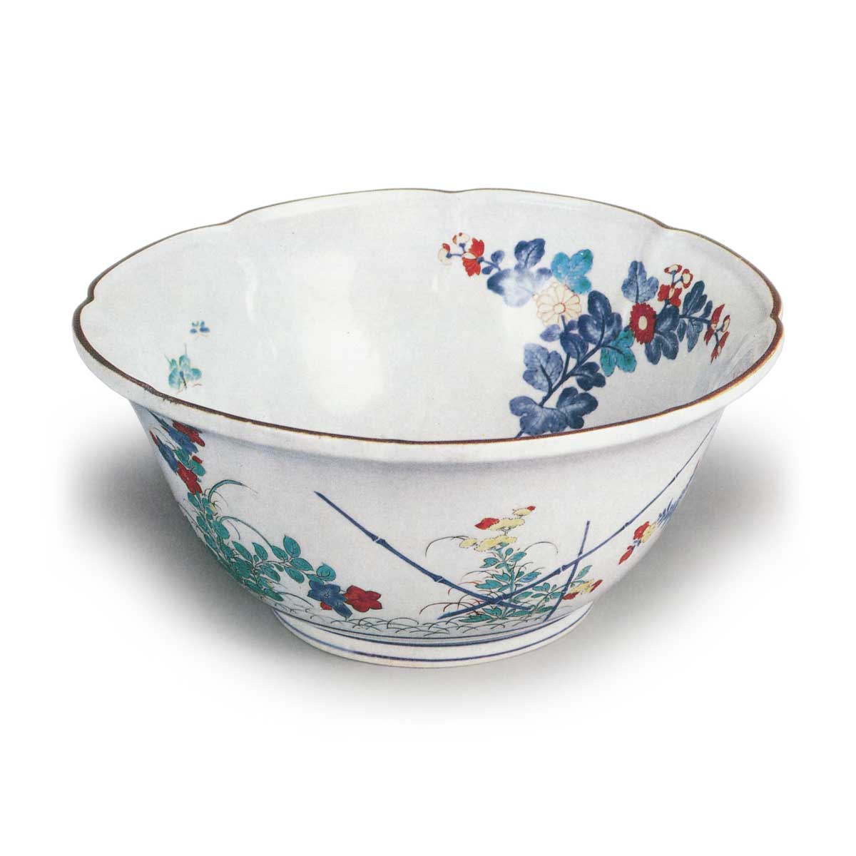 内壁自口沿向八方饰有模压浮纹,内壁绘折枝菊与飞蝶,外壁则以青花与彩绘并施,描绘菊、女郎花、桔梗、蔓草等秋草,笔触流畅优美。