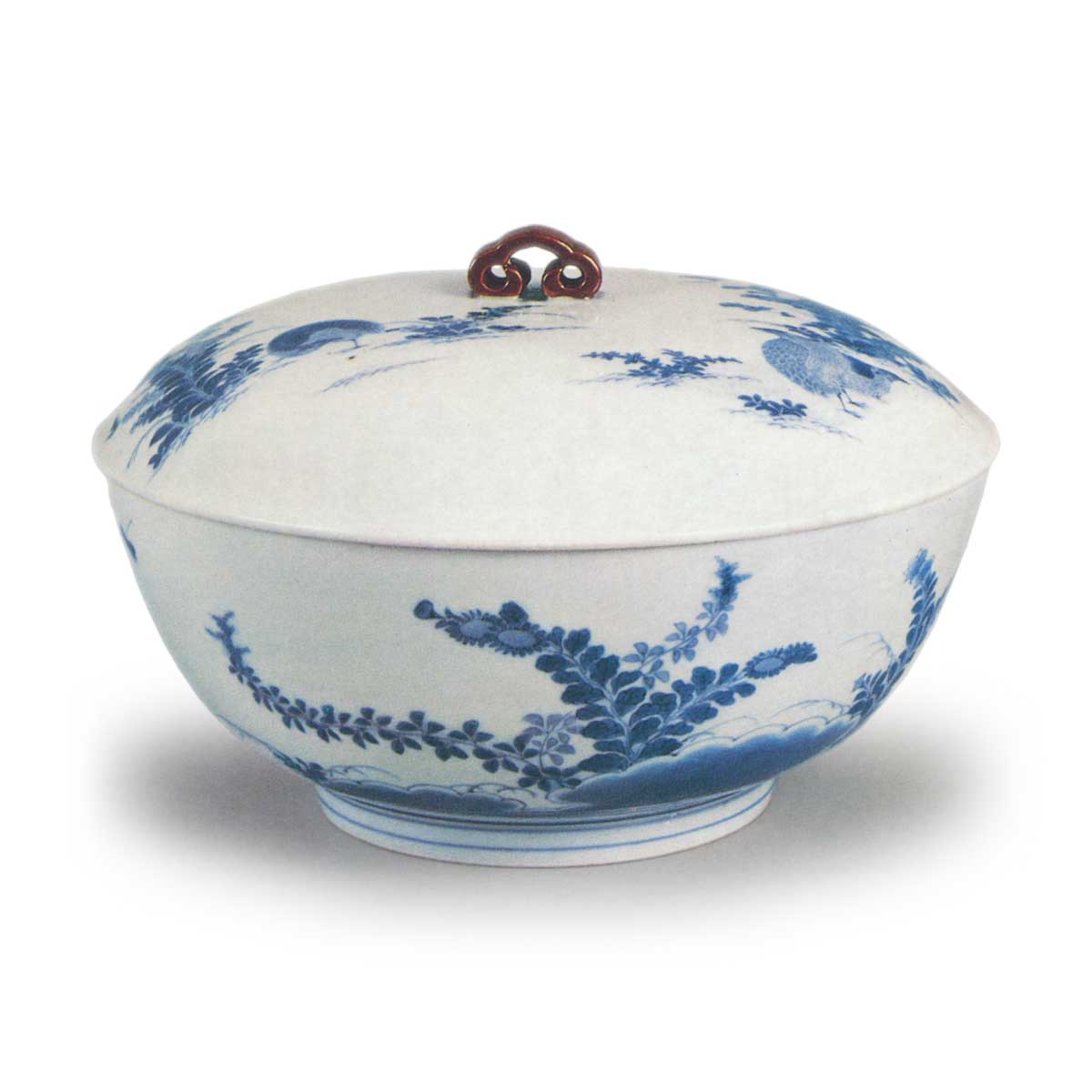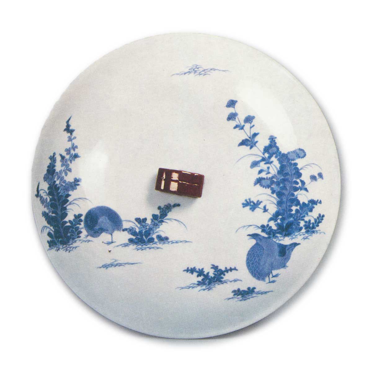 青花鹌鹑秋草纹盆 日本青花鹌鹑秋草纹盆 2025.09.21 青花鹌鹑秋草纹盆 青花鹌鹑秋草纹盆 高13.7厘米 口径20.8厘米 底径10.8厘米此器与色绘盖物同形,盖甲中央饰以锈釉云形缨带,左右两侧淡雅绘有秋草与鹌鹑纹样。器身外侧一侧绘女郎花,另一侧则以菊花为主题呈现秋草纹。器形与纹样皆属典型的柿右卫门风格,且高台内圈内绘有柿右卫门系特色角福铭,并留有五处釉下痕迹。虽见过数件此类青花盖物,然此作工艺最为精湛。应属元禄年间作品。