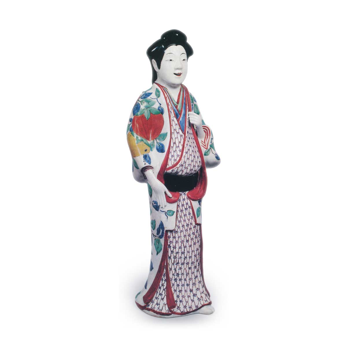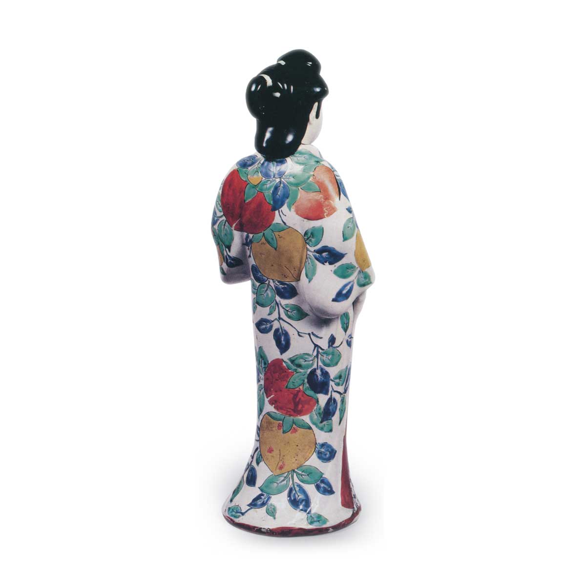 彩绘人偶 摆件彩绘人偶 2025.09.21 彩绘人偶 彩绘人偶 高28.8厘米 宽13.4厘米在以所谓宽文美人为原型的立像人偶中,此作堪称最富韵致之作。其发髻高耸如御所髷,面部表情亦显雅致。身着饰有网目纹样的小袖,外披遍布粗犷桃果纹样的大褂,此类粗粝纹样恰是宽文时期的流行特征。虽具髷发、短裄衣等典型宽文样式特征,但制作年代并不久远,应属延宝至元禄时期。因底料为上等白瓷,红、黄、青、绿等彩绘颜料皆显色艳丽。江户时代此类人偶通常被称为伊万里柿右卫门人偶。