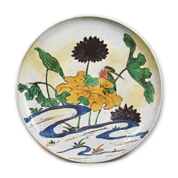 此作曾为英国著名藏家德拉梅尔先生所藏,堪称此类彩绘碗中的杰作。碗内饰柑橘枝叶纹,碗身以独特的莲花式唐花纹与狮子纹,以唐草纹样自由舒展地呈现。此作亦应为宽文前期以前之作。