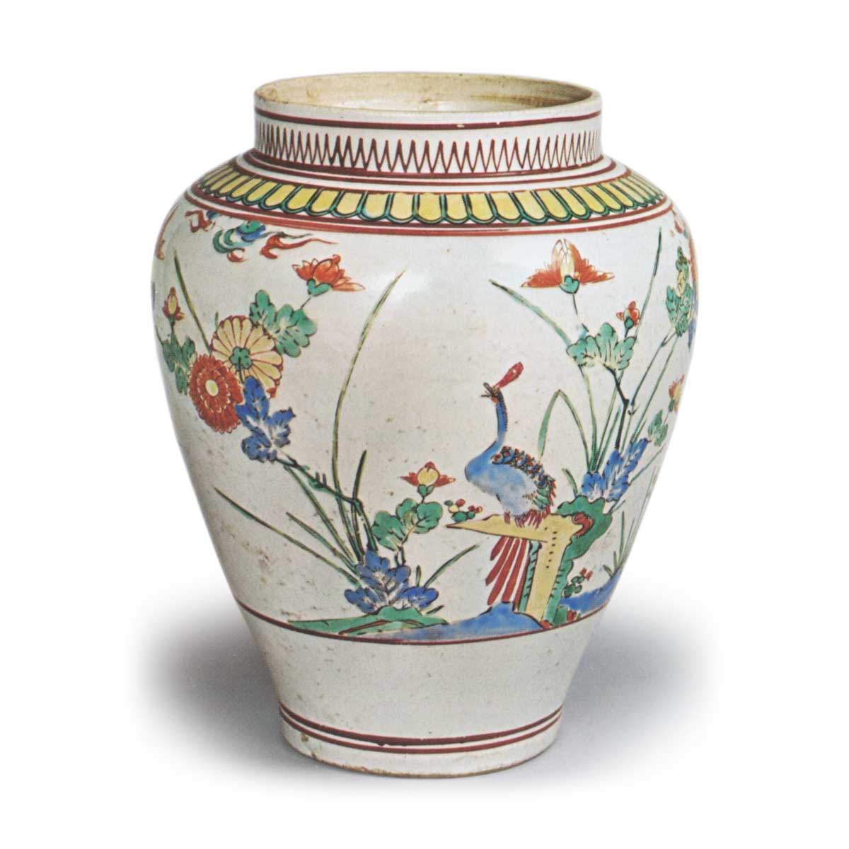 色绘菊孔雀纹壶 日本色绘菊孔雀纹壶 2025.09.25 色绘菊孔雀纹壶 高21.3厘米 口径11.1厘米 胴径17.9厘米 底径8.9厘米此作以奇形太湖石为基座,其上栖息孔雀,两侧配以枝叶舒展的菊花,作为柿右卫门风格的纹样,其创作手法略显别致。肩部以鲜明黄色勾勒菊座轮廓,背面绘有梅花图案,此类表现手法亦属罕见。