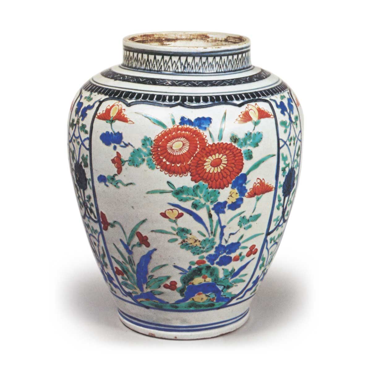 色绘菊纹壶 日本色绘菊纹壶 2025.09.25 色绘菊纹壶 色绘菊纹壶 这两件作品构图基本相同,器形也极为相似。颈部至肩部均以青花绘制纹样。壶身采用三方割窗镂空技法,内壁均绘有菊花图案,其色调与描绘手法亦高度一致。以太湖石为底衬衬托菊花的构图,如今被普遍视为柿右卫门风格的象征。此类作品多为荷兰东印度公司订制,据考曾有相当数量的同类器物出口欧洲。