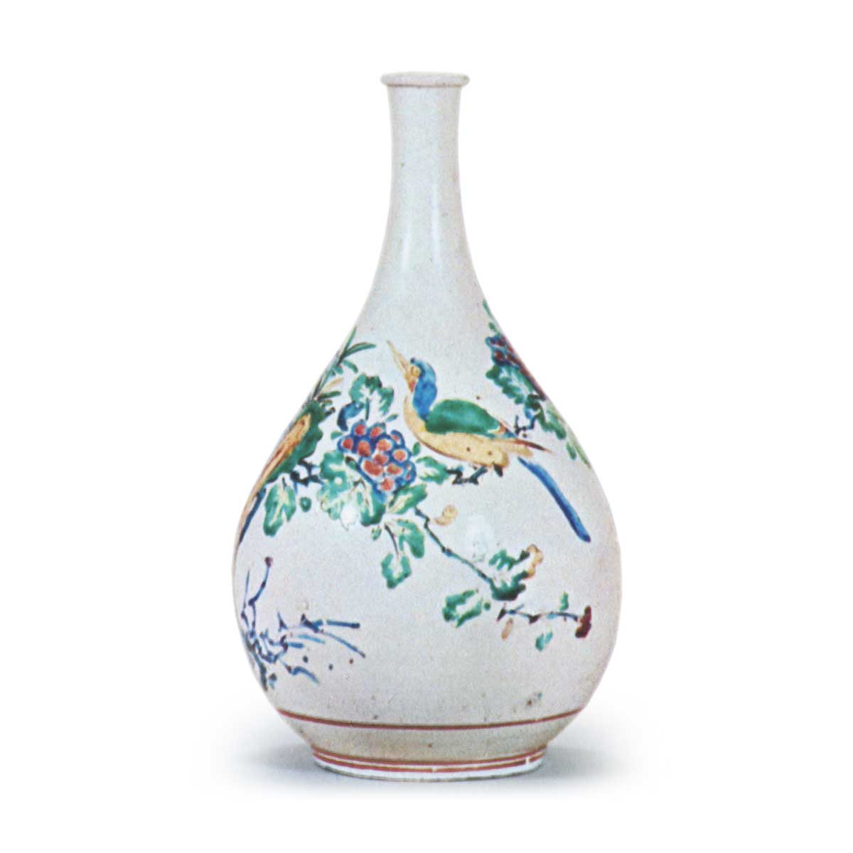 色绘花鸟纹德利 容器色绘花鸟纹德利 X Facebook Hatena Bookmark LINE Pinterest 复制 2025.09.25 色绘花鸟纹德利 高30.0厘米大都会艺术博物馆此器应属初期乳白手素地,以大型太湖石为中心,左右环绕牡丹枝条,枝上栖息一只飞鸟,其表现手法与图43所示壶器极为相似。太湖石向上大幅延伸的构图,实因该处素地胎面存在窑疵,为掩盖窑痕特意绘制太湖石图案,此意图显而易见。此纹样堪称后来成熟的柿右卫门样式的先驱,花卉色彩亦采用以青色勾勒红色的古雅手法。在粗犷笔触中仍透出精准的描绘功力,堪称早期柿右卫门色绘作品中最为杰出的典范之一。