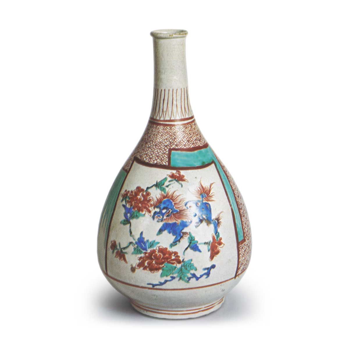 色绘狮子牡丹纹酒壶 容器色绘狮子牡丹纹酒壶 2025.09.25 色绘狮子牡丹纹酒壶 高27.4厘米 口径3.7厘米 胴径15.4厘米 底径9.5厘米此酒壶作法与前图相似,壶身呈色纸形,一侧绘有狮子与牡丹,另一侧则饰以石榴图案。
