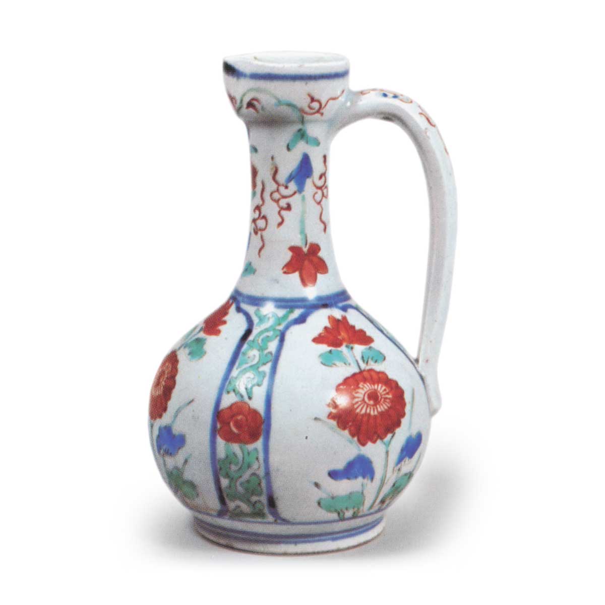 色绘草花纹水注 容器彩绘草花纹水注 2025.09.25 彩绘草花纹水注 彩绘梅树纹水注 彩绘梅树人物纹水注 彩绘菊纹水注 彩绘草花纹水注 彩绘草花纹水注 色绘草花纹水注、色绘梅树纹水注、色绘草花纹水注,这些水注作为茶壶同样是为出口而制作的,其中色绘草花纹水注与色绘梅树纹水注尤为制作精良。素地采用乳白手风质地,全器仅施彩绘上彩。其中梅树纹水注与草花纹水注以青花勾勒窗格,内饰洋花风格草花及梅、牡丹、菊等纹样。此类器物应与荷兰文献记载的“flask”(即水注)相符。