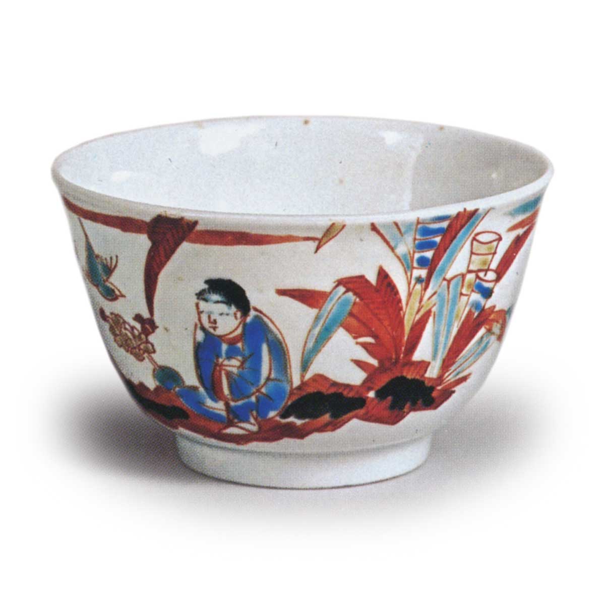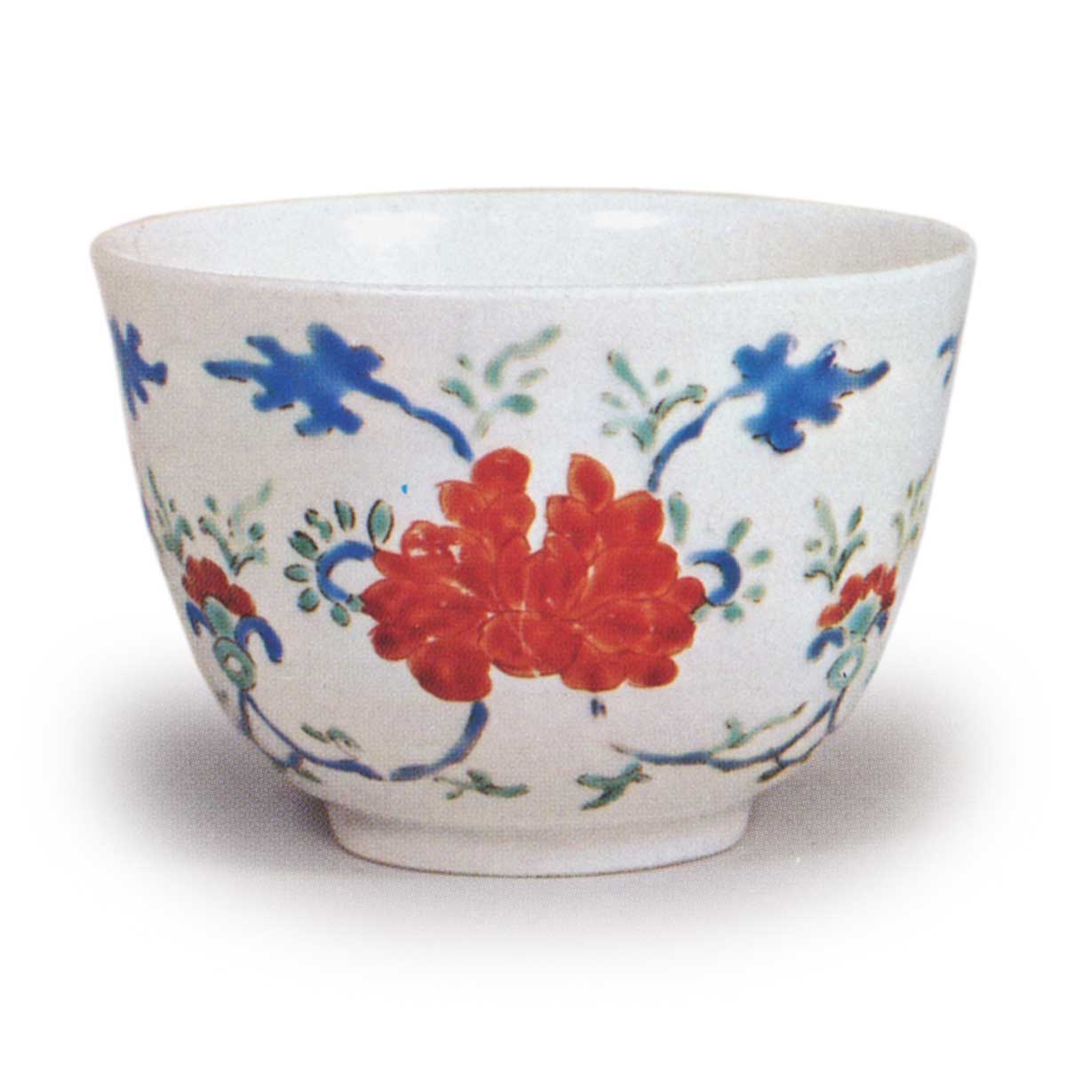 色绘杯 日本彩绘芭蕉唐子纹杯 2025.09.25 彩绘芭蕉唐子纹杯 彩绘牡丹唐草纹杯 此类小杯似乎也作为出口商品被大量量产,在欧洲流传甚广,近年我国也引进了多种纹饰款式。图83所示杯身饰有唐童与芭蕉、小鸟并置的图案,此类彩绘纹饰实属罕见。图84则以三方牡丹花纹为基底,环绕着唐草纹饰。