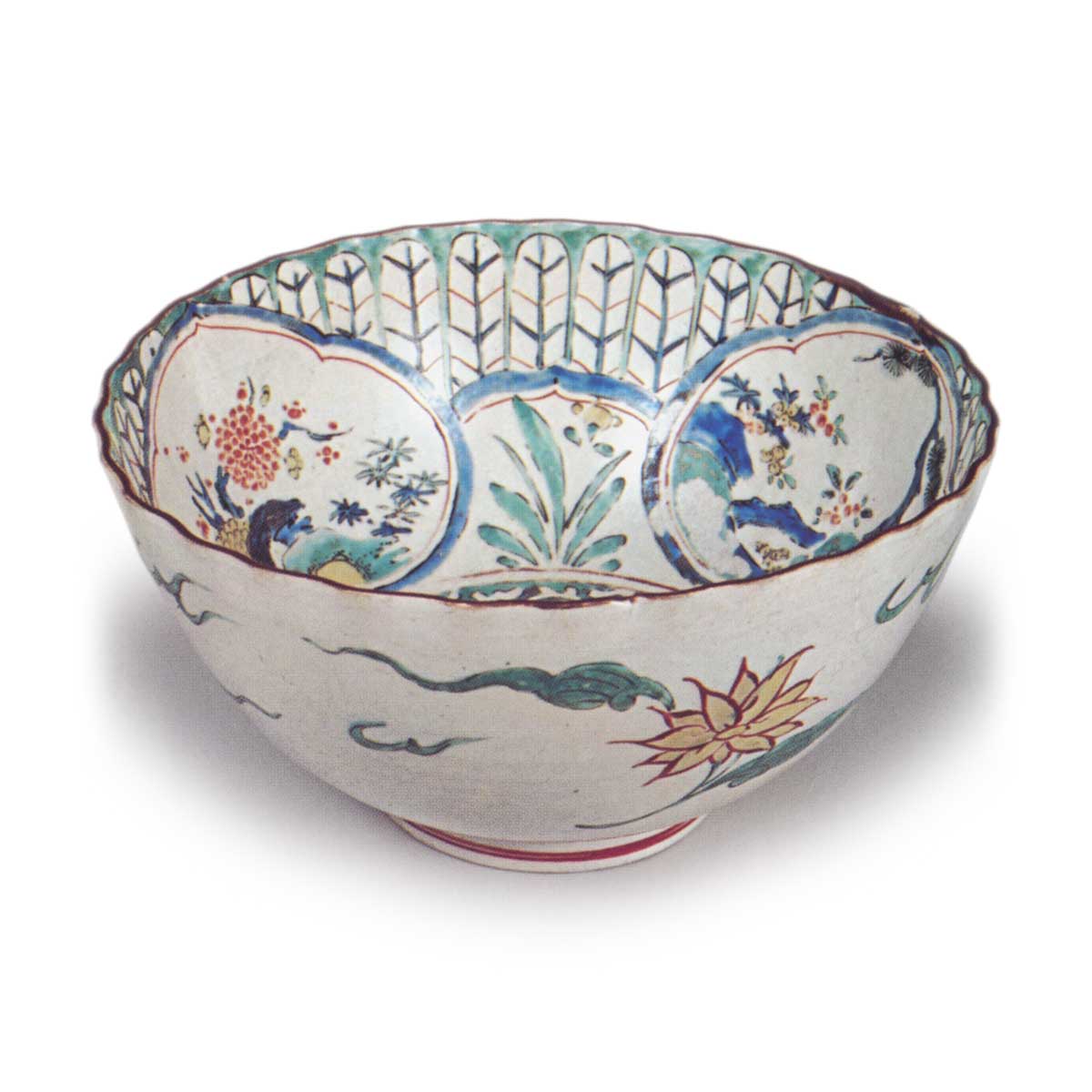 色绘松竹梅纹碗 日本色绘松竹梅纹碗 2025.09.25 色绘松竹梅纹碗 高10.4厘米 口径21.2厘米 底径8.6厘米碗身采用红边乳白手风素地,烧制略显柔和,胎体质地温润。外侧饰莲花状花纹与飞云纹,内壁三面绘制圆窗纹样,窗内分别描绘松、竹、梅三景。口沿饰以箭羽纹,内壁于圆窗内绘有白地鱿鱼藤蔓纹。此为罕见遗品,据其作风推测应属宽文至延宝年间作品。