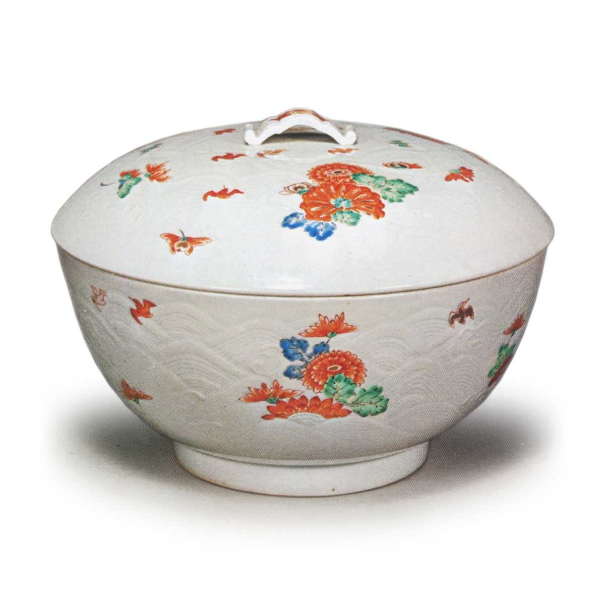 色绘菊水纹盆 日本色绘菊水纹盆 2025.09.25 色绘菊水纹盆 高13.1厘米 口径18.0厘米 底径8.0厘米此作与色绘菊水纹碗作品基本相同,盖身皆饰浮雕波纹,其上散绘菊花与鹬鸟纹样。采用柿右卫门样式乳白手典型的素地,高台处残留四处细小烧痕。据推测烧制年代应为延宝后期至贞享、元禄时期。