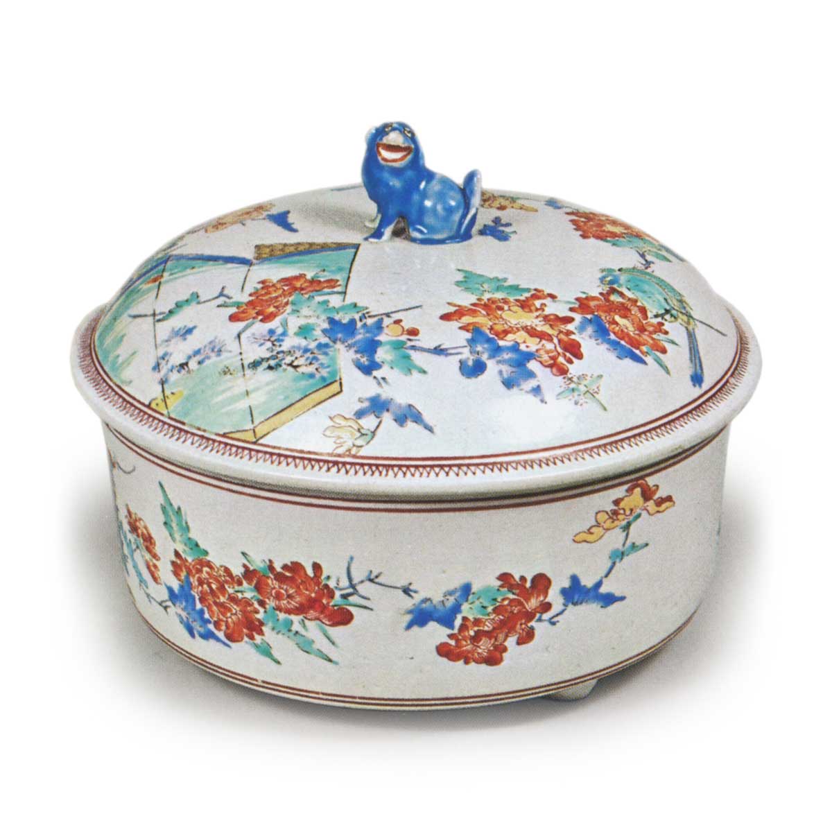 色绘花鸟纹碗 日本色绘花鸟纹碗 2025.09.25 色绘花鸟纹碗 高13.7厘米 口径17.7厘米 底径11.6厘米此为狮形提绳盖碗,乳白釉素坯烧制得略显柔和。盖面饰屏风图与牡丹鸟纹,牡丹枝杈顺应器形呈圆弧状舒展。器身侧面亦环绕牡丹纹,笔触稍显纤弱。