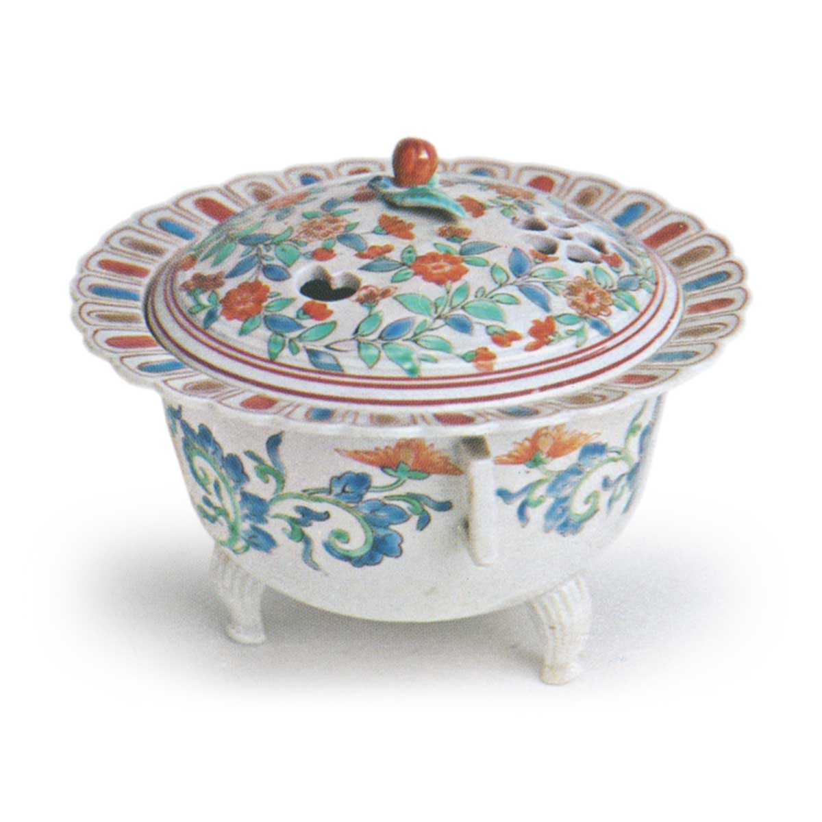 色绘花唐草纹香炉 日本色绘花唐草纹香炉 2025.09.25 色绘花唐草纹香炉 高14.5厘米 三足作风与前图大致相同,但此件并非染锦手工艺品,而是以乳白手素地为底,仅用上绘技法表现纹样。以花蕾为绳结,边缘饰莲瓣纹,盖面纹样环绕成唐草风格,炉身则粗犷地以唐草纹样表现菊花。上绘采用赤、青、薄绿三色,并点缀金彩。