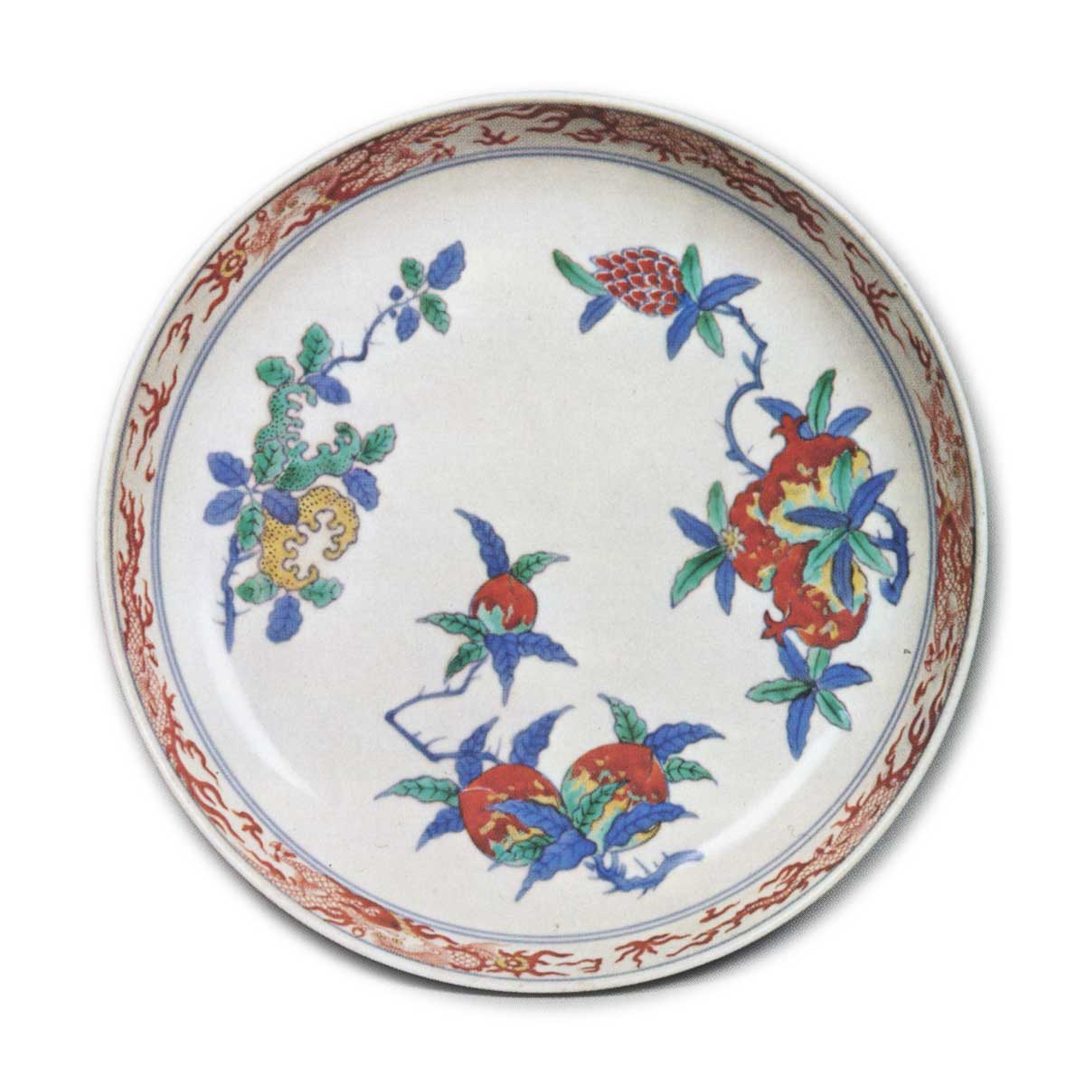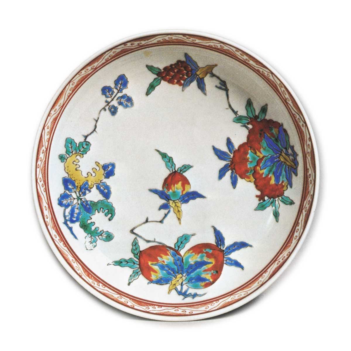 色绘三果纹盘 日本色绘三果纹盘 2025.09.26 色绘三果纹盘 色绘三果纹盘 均为边缘圆润隆起的圆形平盘,饰有与色绘三果纹盘相同的果实纹样。色绘三果纹盘未使用青花底彩,仅施上彩;而此盘则采用青花勾勒枝叶与盘缘线纹的染锦技法。另有与本品风格相近之作,其底面题有“延宝年制”铭文。若该纪年铭文确凿无误,则此类作品可推定为延宝年间之作。器背中央镌刻角福铭,外缘饰以唐草纹。