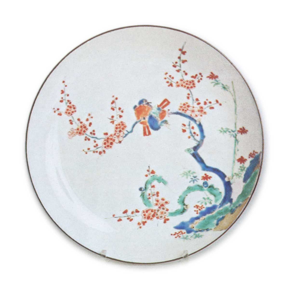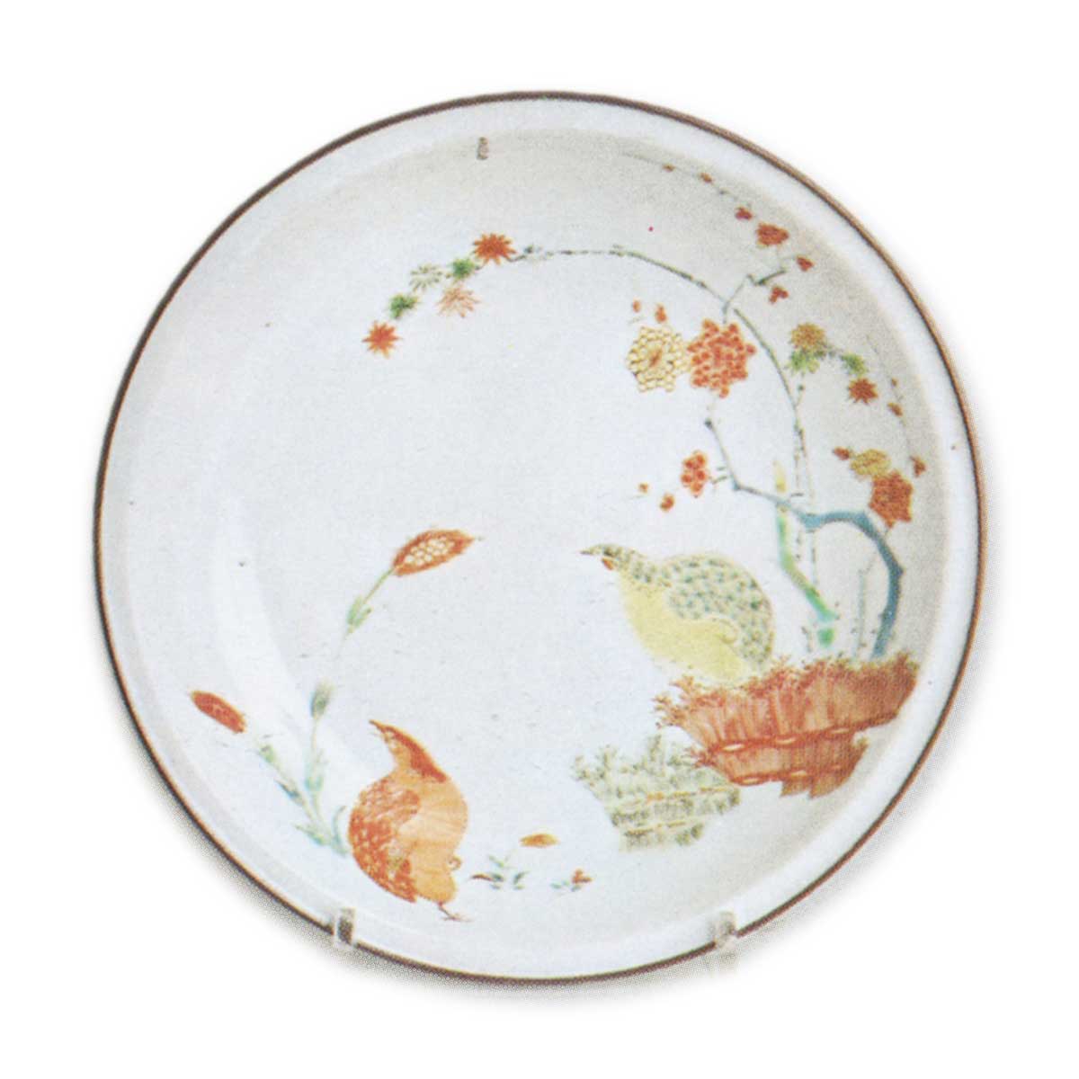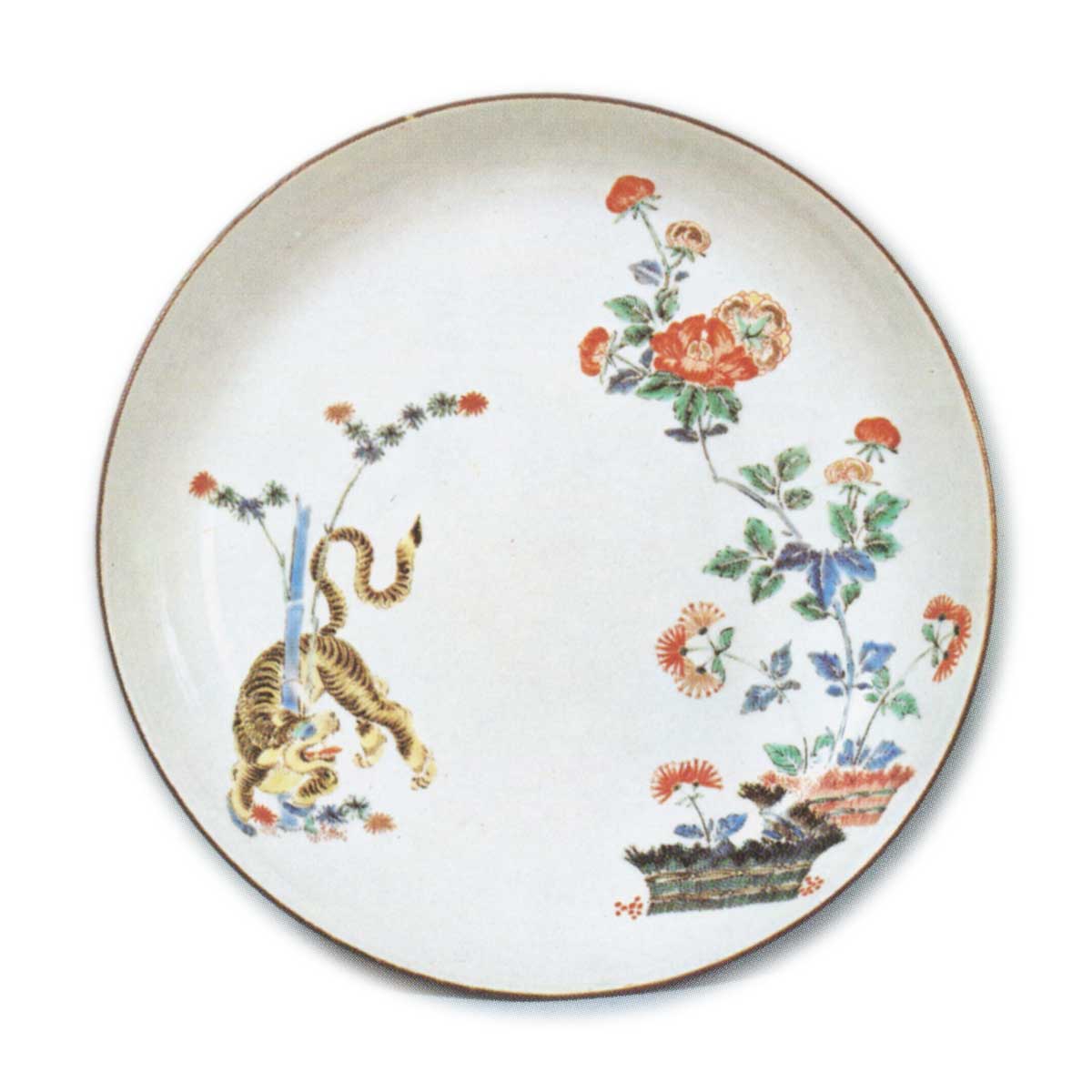 这些是乳白手绘彩的圆形盘。虽应属元禄年间作品,但年代可能稍晚。不过应该不会晚于1710年代,即享保初期。色绘牡丹竹虎纹盘以竹虎、牡丹及雏鸟为纹样,图案虽略显粗犷,却是罕见的纹饰盘。