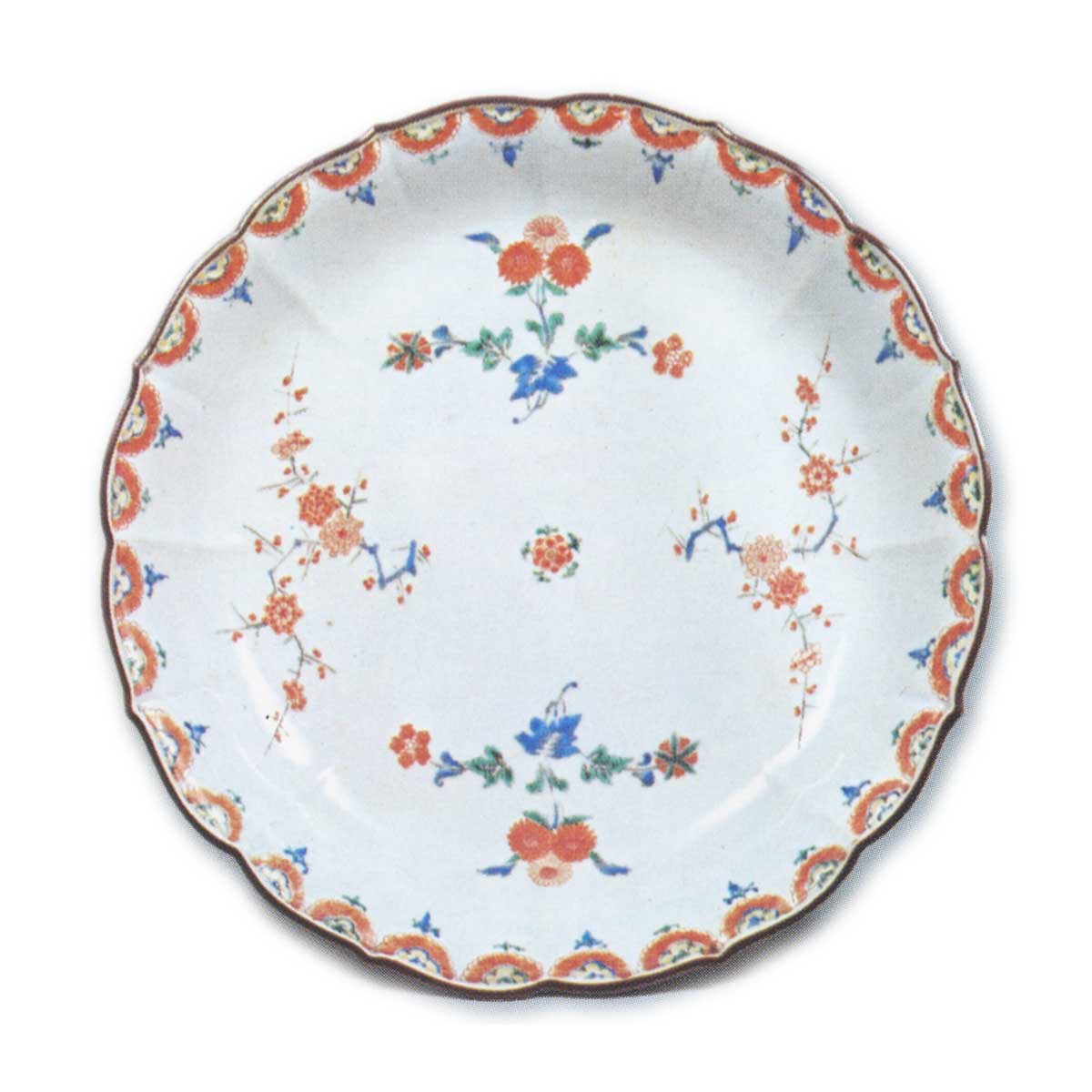 彩绘花卉纹盘以菊梅折枝相对相映的雅致图案为主体,盘缘饰八瓣轮花纹,外圈环绕蕾丝状纹样,高台内残留四个足痕。色绘松岛纹盘呈现如松岛般景致。其素坯乳白釉面充分留白,绘纹雅致精炼,同类器物实属罕见。