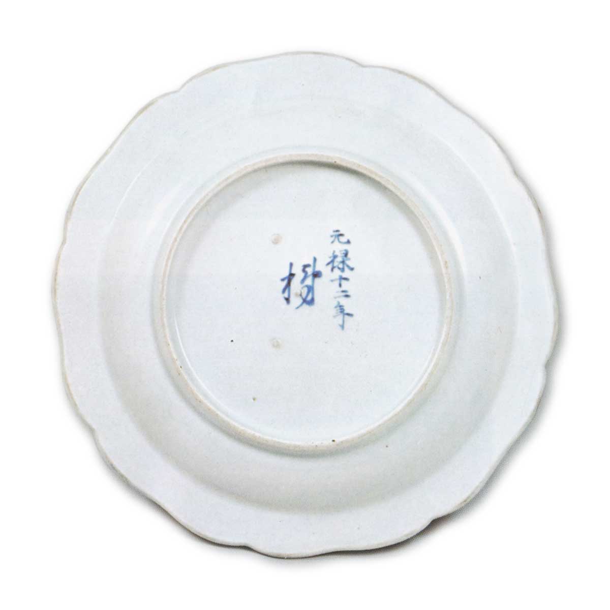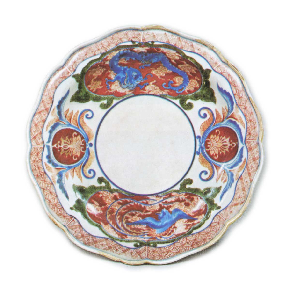 色绘龙凤唐花纹盘 元禄十二年铭 日本色绘龙凤唐花纹盘 元禄十二年铭 2025.09.26 色绘龙凤唐花纹盘 元禄十二年铭 色绘龙凤唐花纹盘 元禄十二年铭 高2.6厘米 口径21.6厘米 高台径12.0厘米本作品与图22~25等同类器物均带有“元禄铭”,是传统上被称为涩右卫门手工艺的代表作。虽无法确证元禄时期是否存在名为涩右卫门的人物,但推测此作应属元禄时期柿右卫门窑作品。此类元禄铭盘器形独具一格,口沿饰八瓣轮花纹,两侧绘龙凤,间以唐花纹,整体风格承袭古伊万里金襴手技法。
