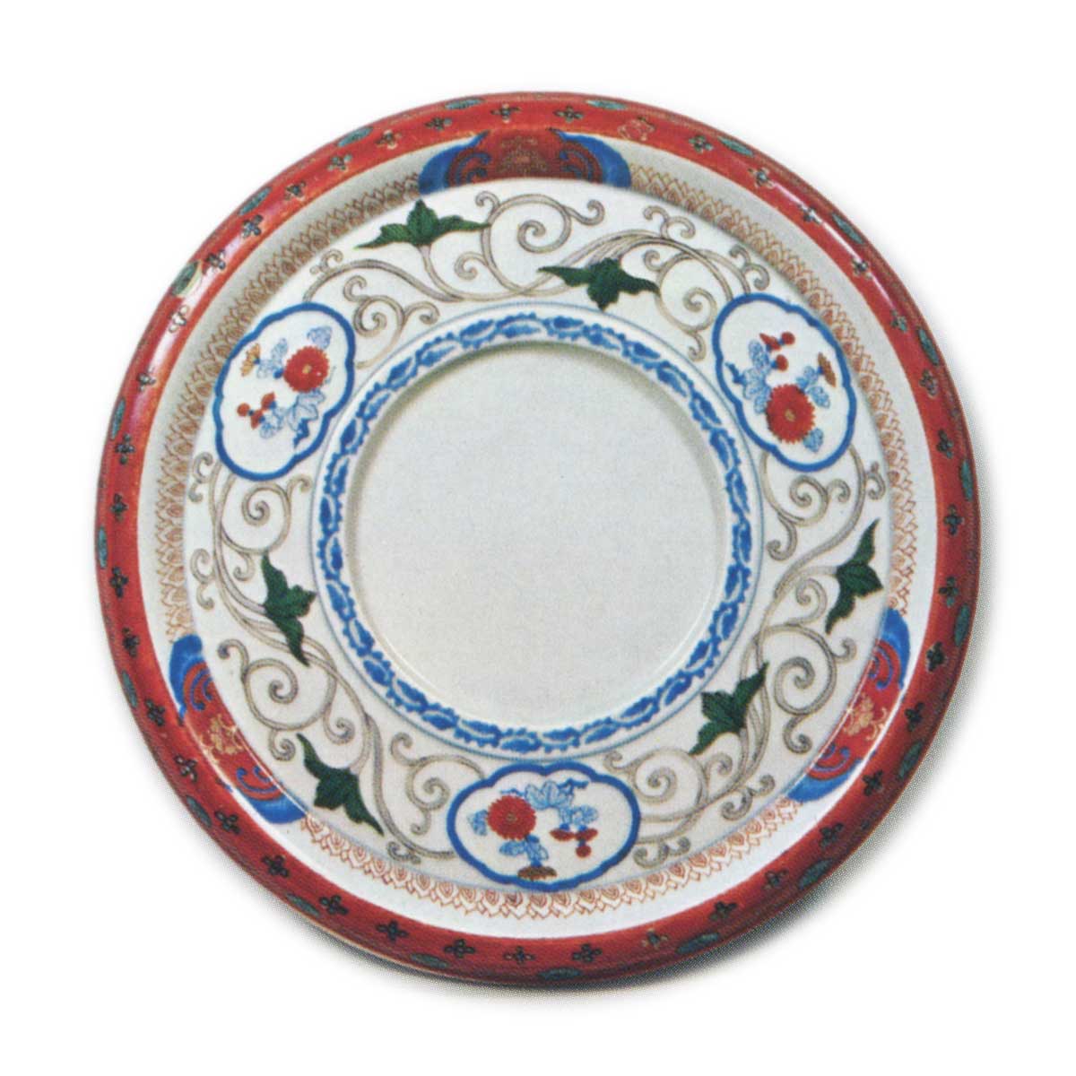 色绘菊唐草纹盘 日本彩绘菊唐草纹盘 X Facebook Hatena Bookmark LINE Pinterest 复制 2025.09.26 彩绘菊唐草纹盘 彩绘菊唐草纹盘 这些器物虽无元禄铭文,却是典型的涩右卫门手工艺品。两件作品的高台内均残留六个小眼痕,呈梅鉢状分布,器形亦完全相同,实为同期烧制的素坯上绘制不同纹样的作品。
