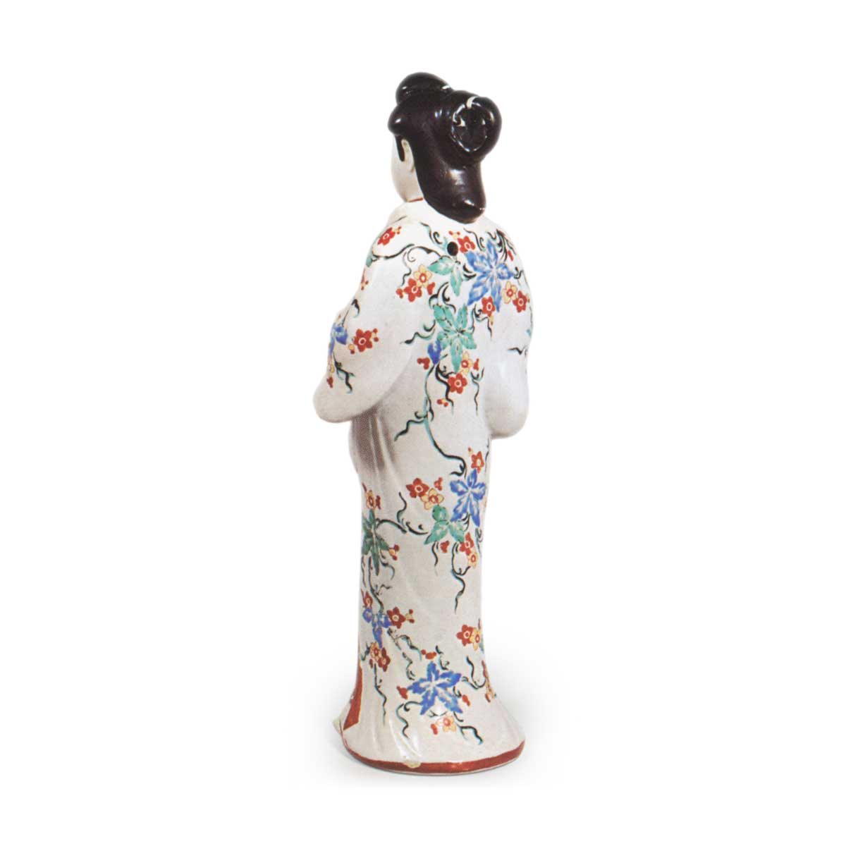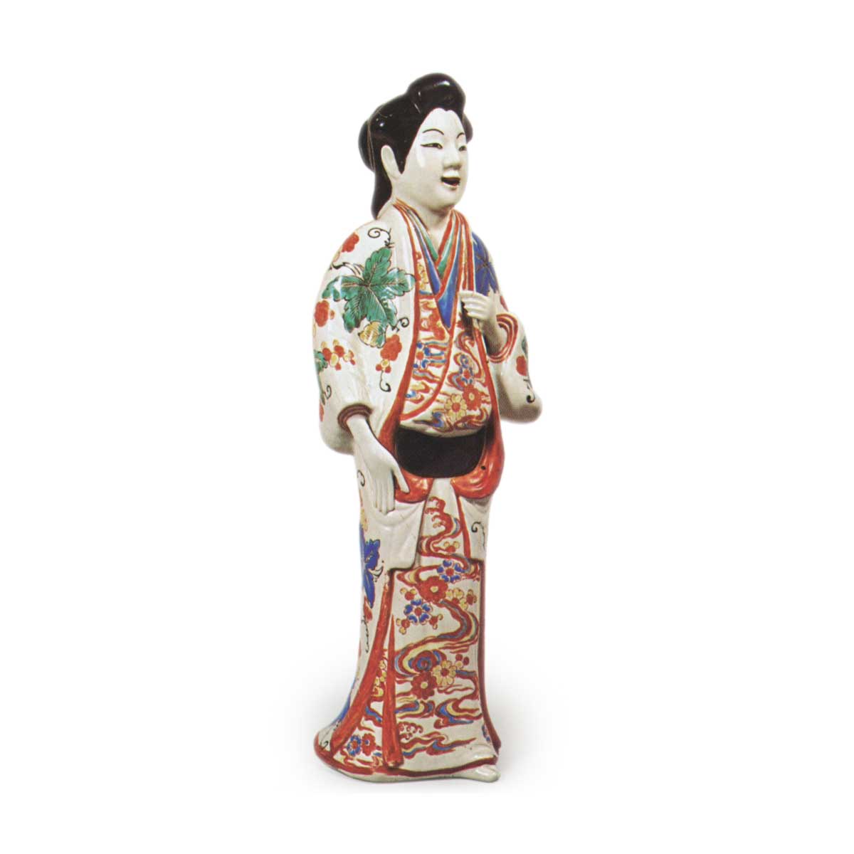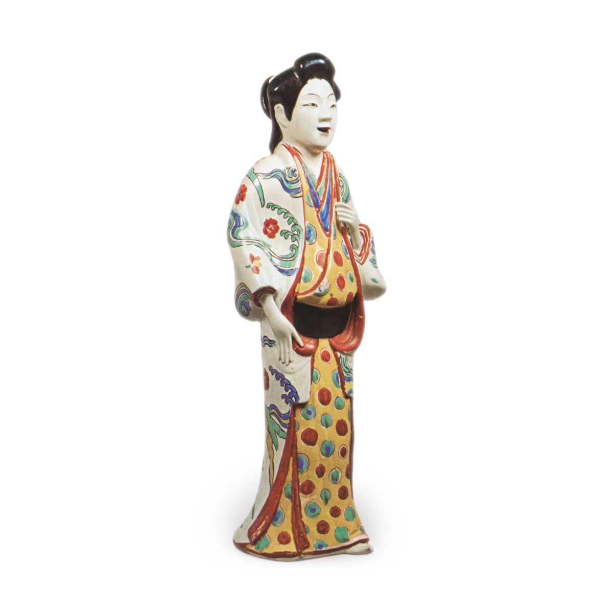 色绘人偶4身着樱川纹小袖,外披葡萄唐草纹打挂;色绘人偶5则以霞色青海波水玉纹小袖为底,外罩饰有“木”字、红叶及棕榈叶纹样的打挂。色绘人偶6身着纱绫纹红叶散落小袖,外披铁线莲唐草纹打挂。所有器物均采用上乘乳白素地,其中色绘人偶5与6的底部仍留有布纹痕迹。各款设计虽取材自宽文时期雏形等传统,却以色绘瓷器特有的表现手法呈现。