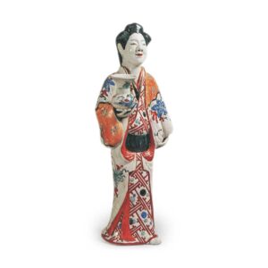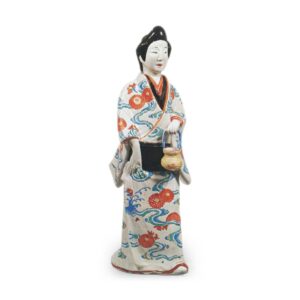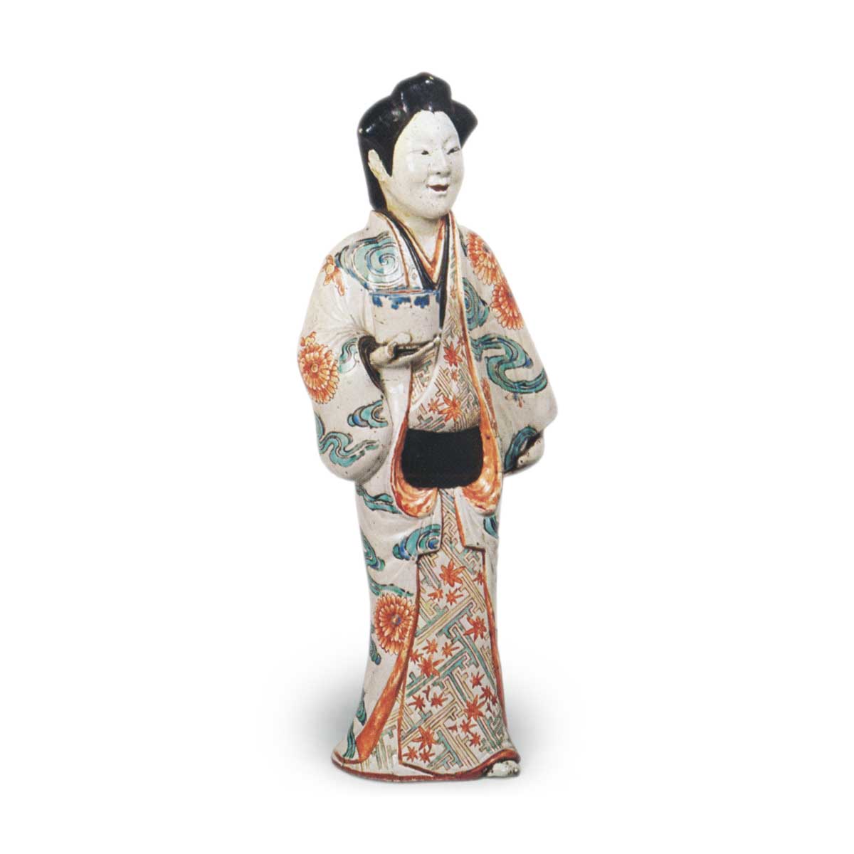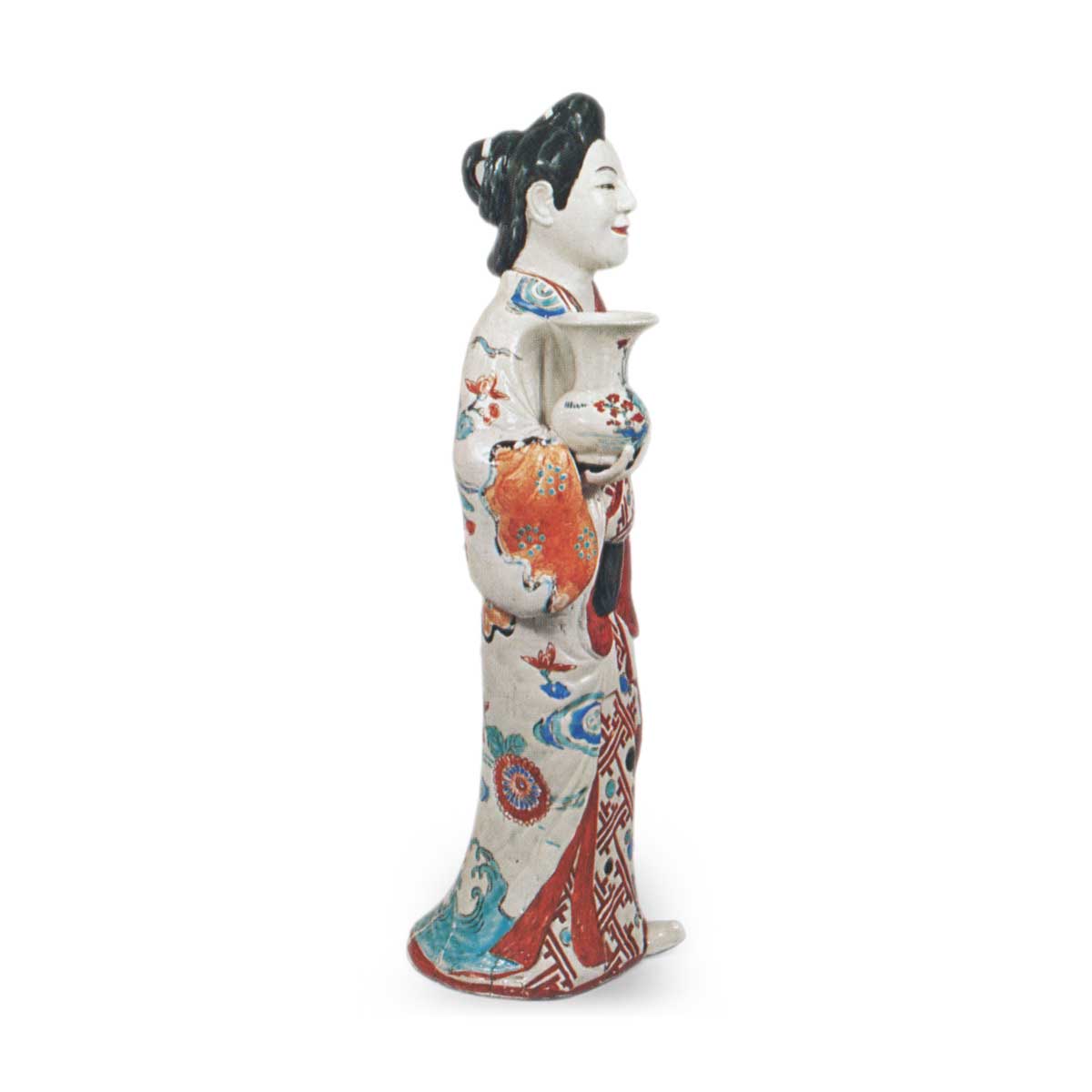 色绘人偶 摆件色绘人偶 2025.09.26 色绘人偶 与前一批人偶相比,这些人偶的素地稍显粗糙,手中捧着香炉或花瓶等器物。由于素地品质不高,彩绘的色泽也欠缺鲜艳度。此外,其面容与发髻造型也与前述人偶群有所不同。色绘人偶1身着纱绫纹红叶散纹小袖,外罩菊流水纹打挂,右手捧持香炉。彩绘人偶2身着纱绫纹水玉小袖,外披葡萄唐草纹打挂;彩绘人偶3同样穿着纱绫纹水玉小袖,外罩菊流水纹打挂。彩绘人偶4罕见地未着打挂,仅穿菊流水纹小袖,手持竹筐。这些作品底部均残留织物纹理。色绘人偶4号作品系从英国请来。