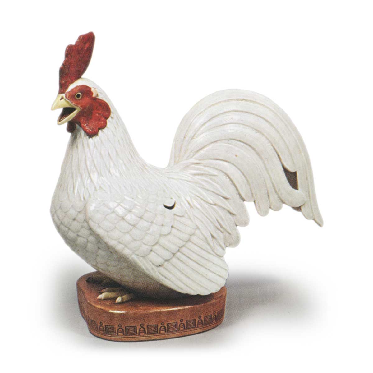 彩绘香炉 日本彩绘香炉 2025.09.26 彩绘香炉 高22.9厘米 宽22.8厘米此为白色雄鸡造型的香炉,仅于鸡冠施红彩、喙部施黄彩,眼部点以黑彩,作为此类彩绘摆件实属罕见之清雅之作。锈色底座侧面刻有雷纹等珍奇纹样。帕雷·豪斯藏品目录所载之摆件,或亦属此类作品。