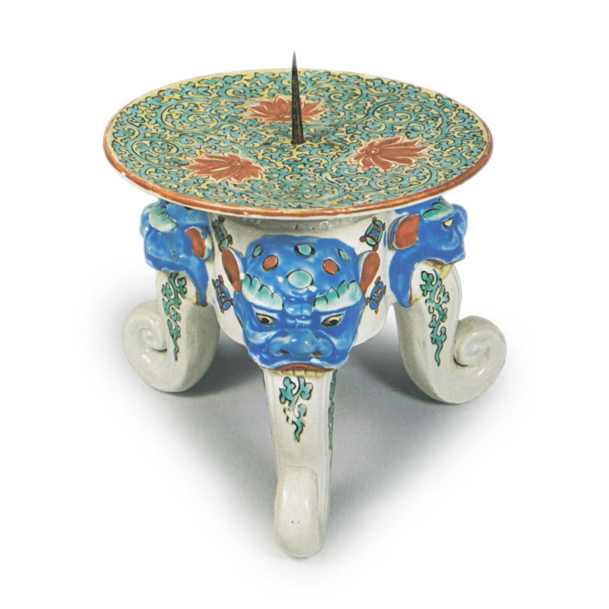 彩绘牡丹唐草纹烛台 摆件彩绘牡丹唐草纹烛台 2025.09.26 彩绘牡丹唐草纹烛台 高13.2厘米 宽16.3厘米 三足栗田美术馆此烛台与前图作风相似,但无烛杆,底座直接连接托盘。托盘饰有三面环绕花朵的唐草纹样,底座侧面亦绘有同款唐草纹,据推测仍属元禄年间作品。