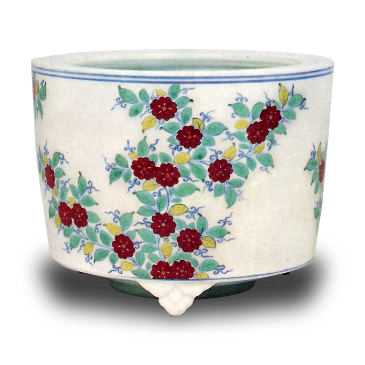此乃底面三方饰云形支脚的千鸟形香炉。其规整造型忠实仿效了砧青瓷的韵致。露胎圆高台展现出致密瓷质。口沿环绕两道、腰部环绕一道青花线饰,胴体两侧描绘着形似五瓣野蔷薇的蔓草纹样。青花骨描线条纤细而端正,笔触却又舒展自如,使这件彩绘作品更显高雅格调。红、黄、浅绿三色上彩烧制均匀,色泽绚丽。此作应为元禄年间大川内窑鼎盛时期的作品,其成型技法与青花描绘的笔触皆透出刚劲之气。
