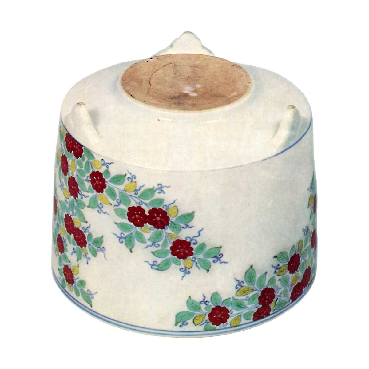 瓶子、香炉、壶等立体器型在色绘锅岛瓷中极为罕见,继瓶子之后声誉最盛的当属此香炉与色锅岛彩绘茶摘纹釜。