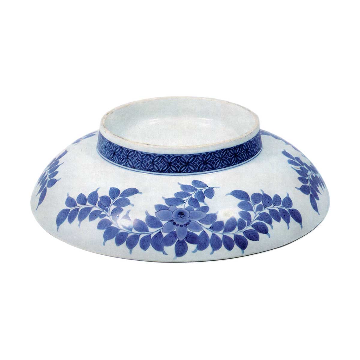 锅岛烧的共同特色在于:器形优美者,其青花或彩绘装饰亦具高雅格调。此皿内壁描绘的盆栽图——岩石间栽植牡丹——其青花勾线与渲染笔触皆精妙绝伦,且青花与彩绘釉色皆绚丽夺目。大铜盆中安放巨岩栽种牡丹的构图,或许借鉴了汉画系的粉本,留白处理的图案设计尤为非凡。此种意匠不仅在锅岛烧中独树一帜,更堪称日本彩绘瓷器史无前例的创新。