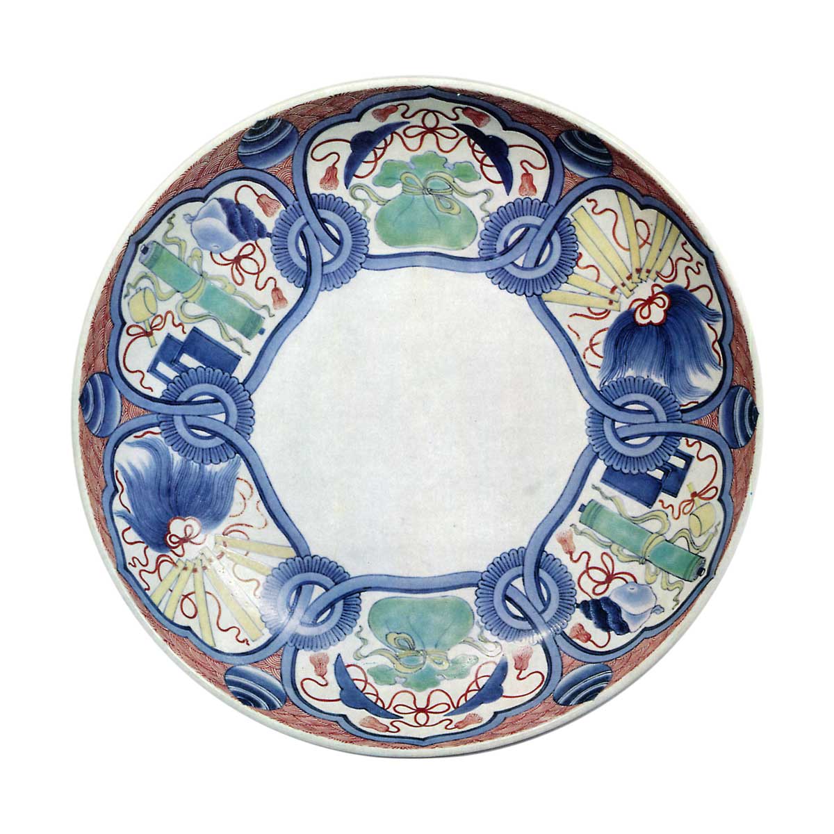 色锅岛彩绘宝尽纹尺皿 日本色锅岛彩绘宝尽纹尺皿 X Facebook Hatena Bookmark LINE Pinterest 复制 2025.09.26 色锅岛彩绘宝尽纹尺皿 高7.7厘米 口径30.0厘米 底径15.7厘米冈山美术馆宝尽纹是大川内藩窑偏爱的纹样,其中八角七寸皿的“寿字宝尽纹皿”最为杰出,而此尺皿的纹样设计亦颇为精妙。以六角形华头窗式边框为基底,边框间以菊座状环圈相连构成基础纹样,其内对称绘制三种宝纹。菊座状环圈的立体表现手法别具趣味,而青花描绘与烧成效果尤为精湛,令人印象深刻。内口沿饰以赤色青海波纹,边框间点缀宝珠纹样。作为色绘锅岛大盘,此作亦属保存完好的典范之一。盘底四隅饰以大朵牡丹花,以叶藤蔓相连构成整体藤蔓纹地纹,高足处环绕七宝衔接纹。