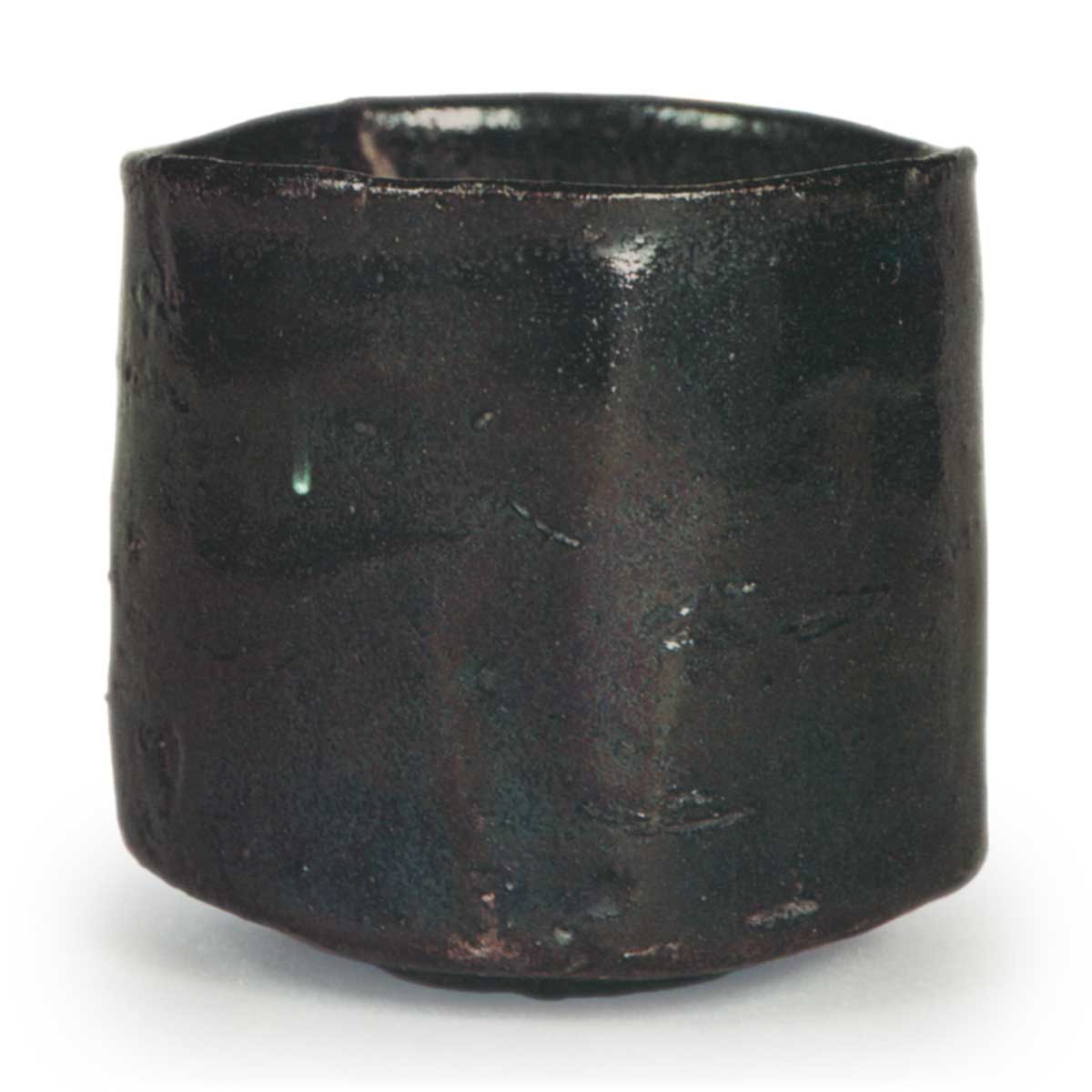 足环到碗身的曲线非常柔和,与典型的濑户黑风格不同,它不是一条几乎水平的直线。 碗身逐渐向边缘变细的形状与小滨烧相似,但小滨烧的边缘呈阶梯状,碗身有明显的棱纹,而这件茶碗虽然也有棱纹,但非常低调,边缘呈轻微起伏,几乎看不出人工雕琢的痕迹。