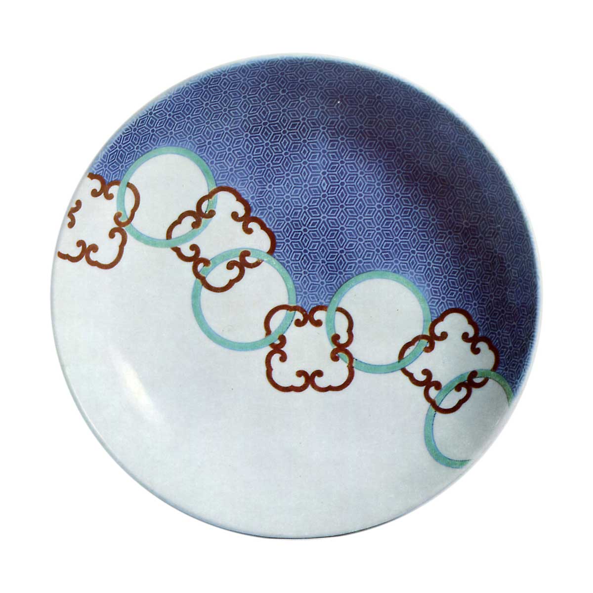 盘面中央以青红双色交替勾勒环形与独特四棱花形,形成鲜明边界:一侧为白地,另一侧则铺满染付小纹。此处采用锅岛秘技“墨はじき”(墨弹技法),不同于染付颜料描绘,白线如型染般纤细鲜明。低矮的胎足经宽幅削制而成,外缘三面饰有菊叶形支足。支足采用琉璃釉底,外侧则遍布着罕见的牡丹唐草纹样,其间点缀着大小不一的牡丹花朵。