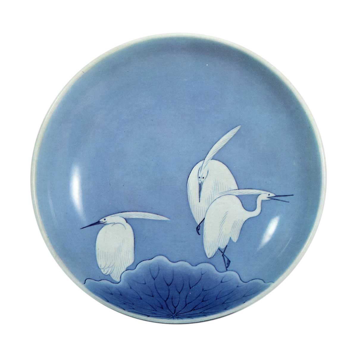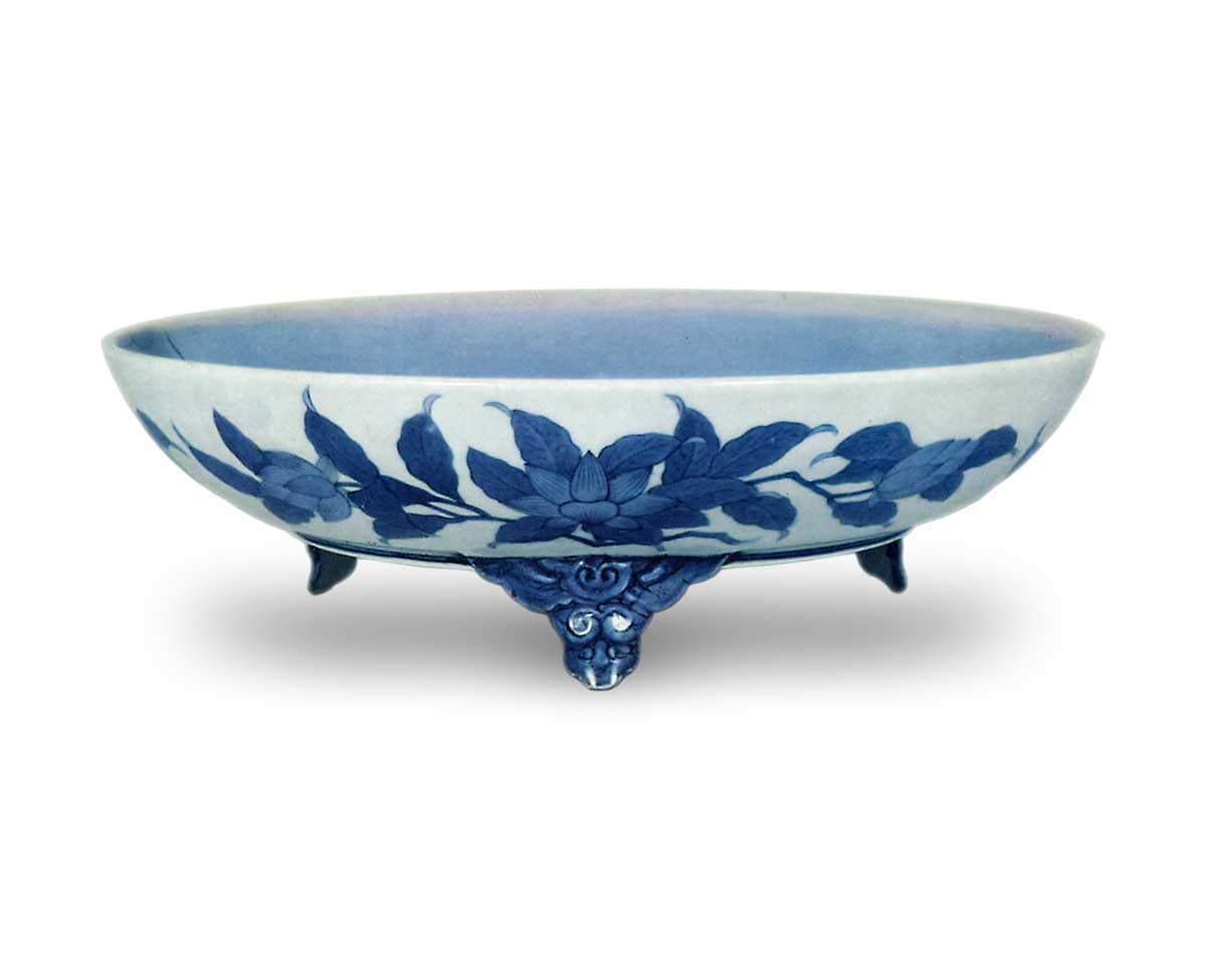 在饰有莲叶的淡瑠璃釉底上,三只白鹭以鲜明纯白之姿跃然呈现。此乃锅岛染付大皿中最为杰出的作品。此作尽显大川内窑青花技艺之精髓:先以线描勾勒白鹭与莲叶,继而于余白釉地及莲叶上,以薄钴蓝(日本对青花用钴蓝颜料的俗称)溶液反复刷涂,却毫无笔触痕迹,釉色均匀无瑕。如此精湛技艺的实现,生动印证了藩窑汇聚了何等杰出的名匠。莲叶配饰裙裾的构思别具匠心,而将此意象淋漓尽致展现的非凡技艺,实值得盛赞。底足采用蛇目风格的低矮宽阔高台,外侧三面附有兽首形支足。露胎高台外缘环绕二十个针堆细密纹点,内缘则有十六个。支足饰以深瑠璃色染付,外侧三面绘有木兰折枝纹,染付色泽浓郁,笔触铿锵有力。