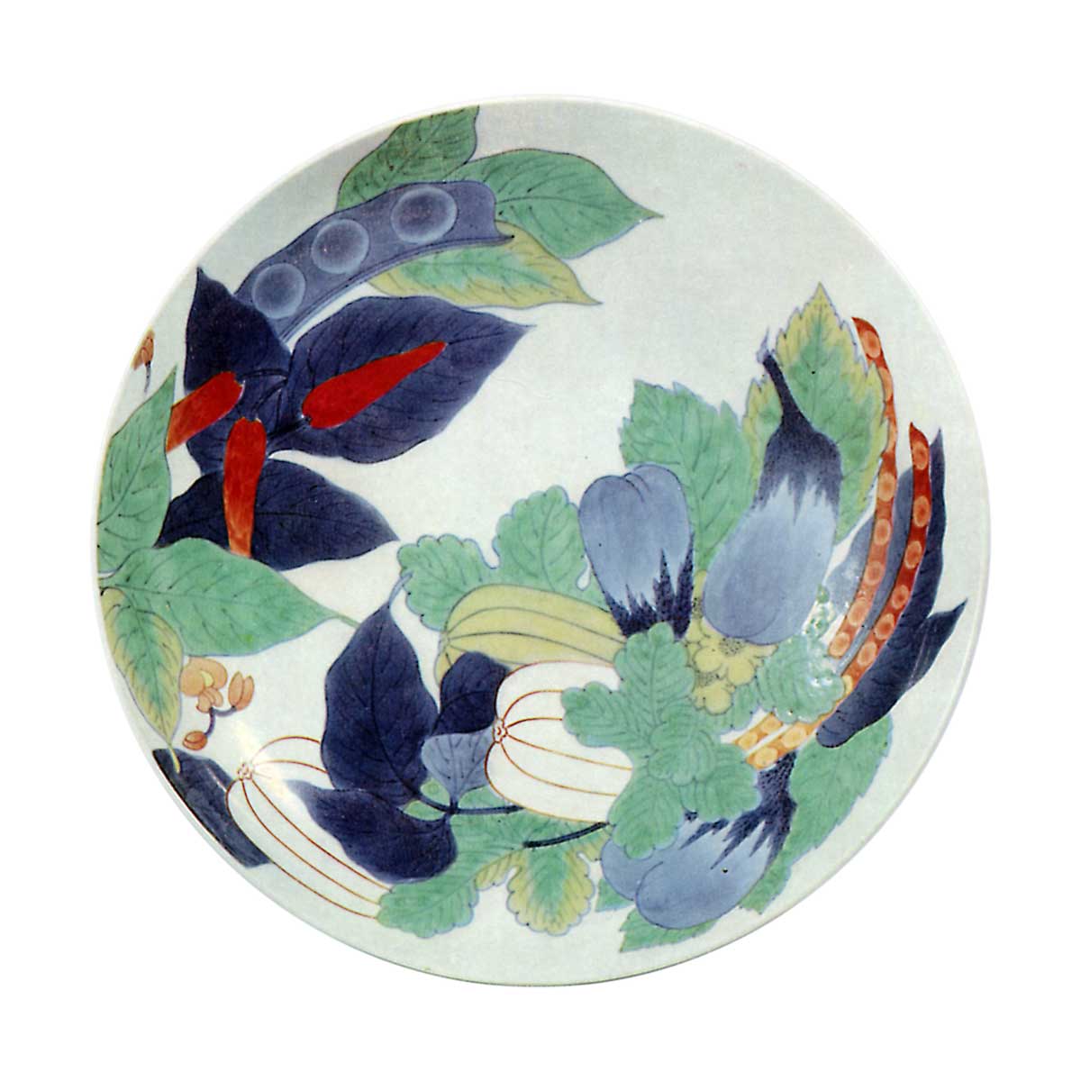色锅岛彩绘蔬菜尽纹七寸盘 日本色锅岛彩绘蔬菜尽纹七寸盘 2025.09.26 色锅岛彩绘蔬菜尽纹七寸盘 高5.8厘米 口径20.2厘米 高台径11.2厘米蔬菜尽纹样在锅岛七寸盘中亦属杰出设计之一,蔬菜的巧妙布局间可见匠人细腻的匠心。青花绘纹、浓淡晕染、赤、浅赤、浅绿、黄等色泽鲜明,纹样构图与彩绘皆无可挑剔的精品。底纹题有“组绳纹盘”字样。线描技法、浓淡渐变的釉色、赤、浅赤、浅绿、黄等色调皆鲜明明艳,无论纹样构图或绘饰工艺皆无可挑剔的杰作。底纹与“组绳纹盘”完全相同,挺拔器形展现出富有张力的曲线,亦属保存最完好的典范之作。