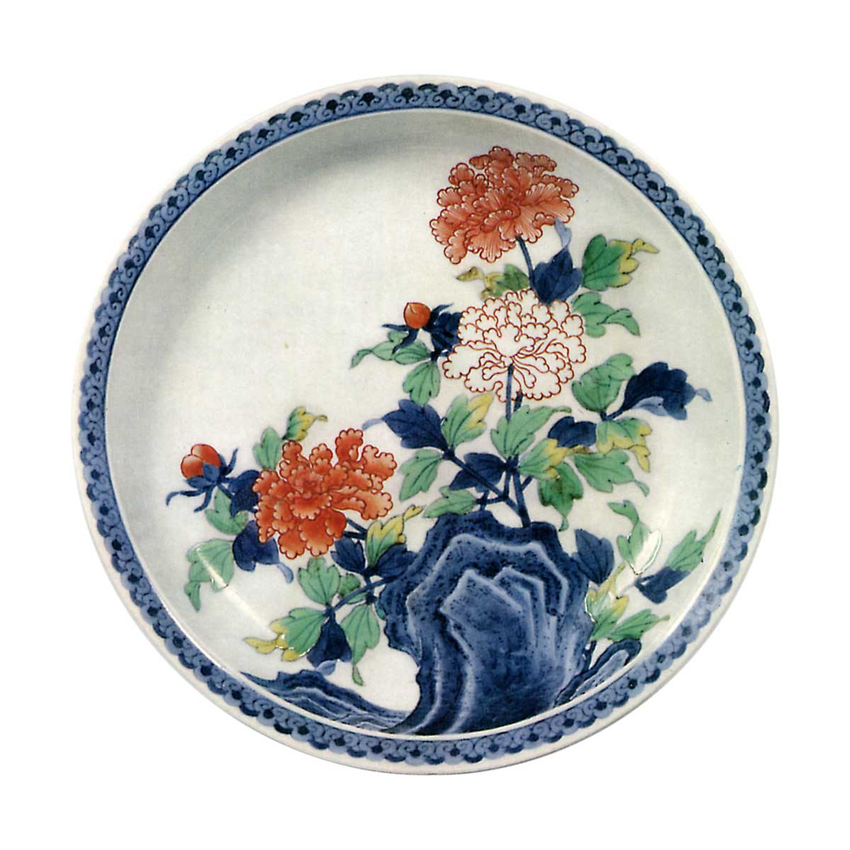 色锅岛彩绘岩牡丹纹七寸盘 日本色锅岛彩绘岩牡丹纹七寸盘 X Facebook Hatena Bookmark LINE Pinterest 复制 2025.09.26 色锅岛彩绘岩牡丹纹七寸盘 高5.7厘米 口径20.3厘米 高台径10.3厘米七寸盘中存在口部呈铙钵状的变形款式,虽不如标准形式常见,但仍存有相当数量的遗品。以扎实笔触将岩石从底部中央偏右位置大幅铺陈,左上角留白处清雅描绘三朵大轮牡丹与两朵蓄花,整体呈现注重留白效果的绘画式构图。更妙的是,三朵牡丹花各具特色:一朵以纤细线描勾勒花瓣,一朵以红线勾勒白牡丹轮廓,另一朵则采用红色晕染技法。盘缘饰以深浅相间的染付如意头衔接纹,底面三方饰七宝结纹,高台则饰有梳纹。