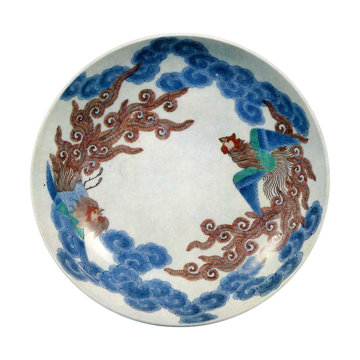 色锅岛彩绘凤凰纹七寸盘 日本色锅岛彩绘凤凰纹七寸盘 2025.09.26 色锅岛彩绘凤凰纹七寸盘 高5.7厘米 口径20.4厘米 底径10.9厘米此乃绝无仅有的七寸盘,描绘两羽凤凰在云间相对飞翔的姿态。云纹以染渍技法呈现,凤凰仅以绿红二色施彩。色调虽淡雅,却反衬出整体高雅的格调。器形制作饱满精巧,底面饰有三处七宝结纹,高台边缘饰以梳纹。