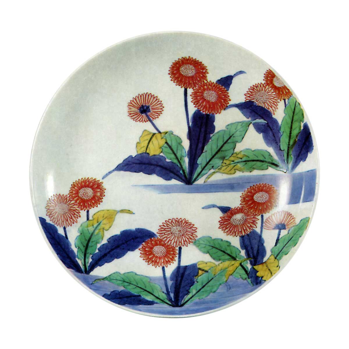盘面以上下两层排列五株蒲公英。仅以春日野畔的蒲公英——这种堪称野草的花卉构筑纹样,恐唯色绘锅岛瓷独有。虽因藩窑身份偏爱吉祥纹样实属自然,但能选取如此质朴的素材,将其融入色绘之美之中,亦是锅岛瓷的特色。其纹样选择绝非形式主义,作为江户中期大藩御用窑的作品,实属耐人寻味。此作堪称七寸盘的代表杰作之一,无论是青花还是彩绘皆臻理想烧成境界,尤以叶片翠绿的色泽最为出众。盘外沿沿袭传统,以六组七宝纹结为一体的“七宝结纹”环绕三周,高台处饰以梳纹纹样,胎土经烧制后泛出微红光泽。此套共五件。