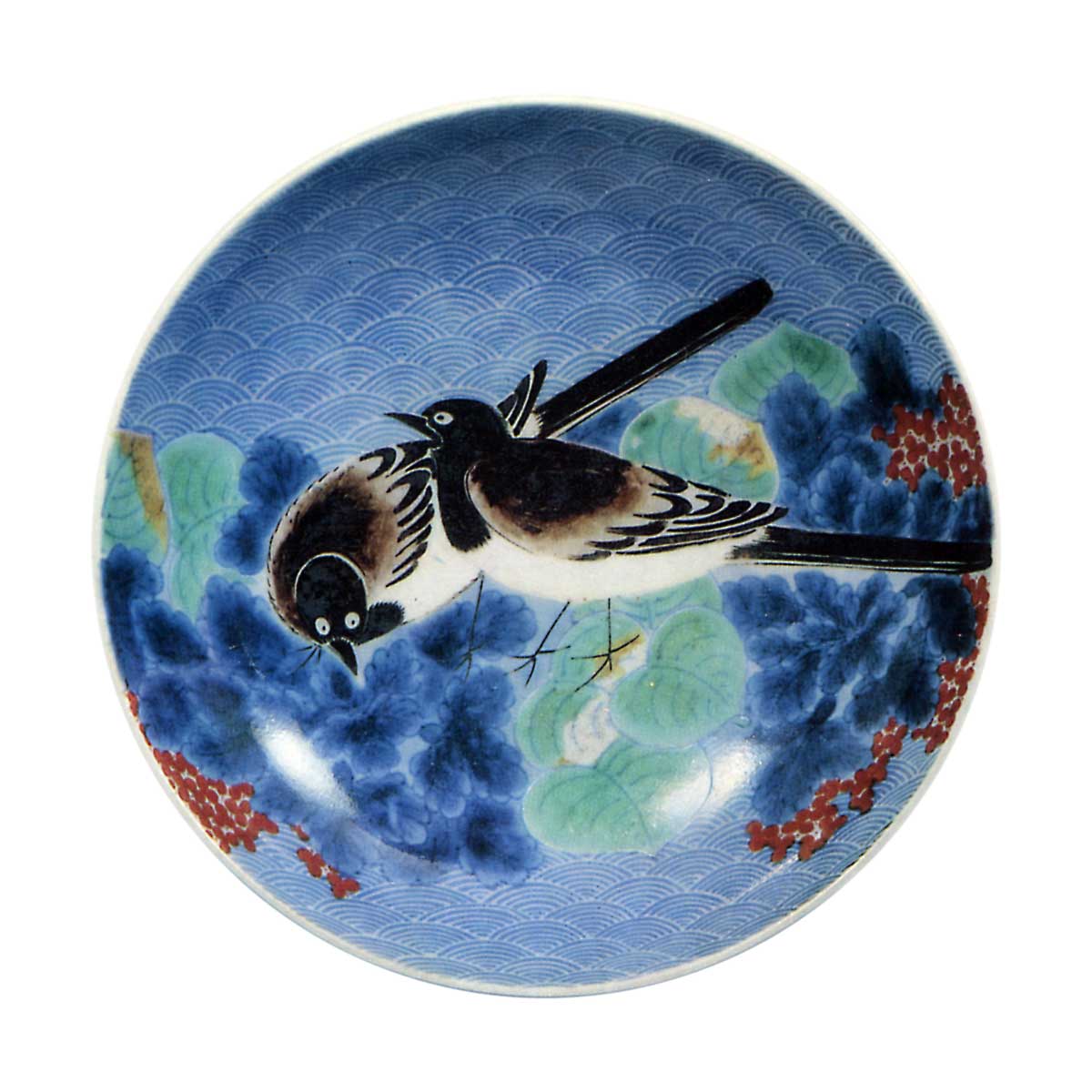色绘鹤鹤纹五寸盘 日本色绘鹤鹤纹五寸盘 X Facebook Hatena Bookmark LINE Pinterest 复制 2025.09.26 色绘鹤鹤纹五寸盘 高4.2厘米 口径15.0厘米 高台径8.0厘米冈山美术馆此为盛期色绘锅岛五寸盘的代表作。画面以水草为基底,点缀两只鹤,余白处以墨渍技法描绘青海波纹。鹤以黑色上釉绘制,此种配色方案在鹤纹盘之外未见其他器物采用。器底三面饰以七宝结纹,高台为梳纹高台。器形立面圆润饱满,充分展现了鼎盛时期的艺术特色。