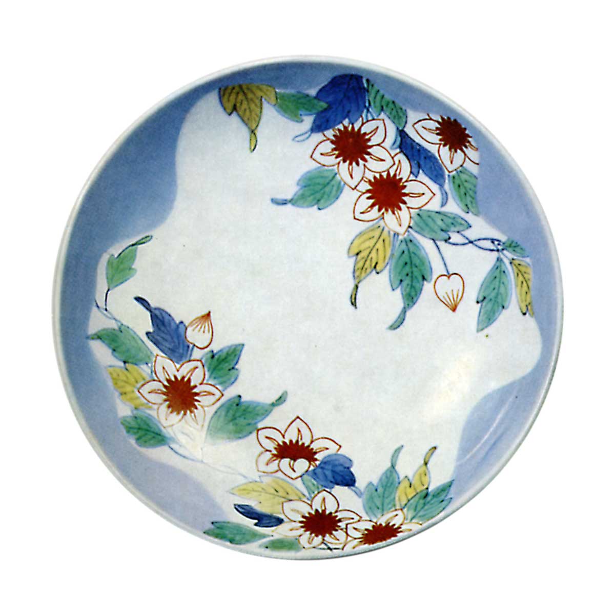 色锅岛彩绘铁线莲纹五寸盘 日本色锅岛彩绘铁线莲纹五寸盘 2025.09.26 色锅岛彩绘铁线莲纹五寸盘 高4.4厘米 口径14.8厘米 高台径8.0厘米此乃彩绘五寸盘中罕见的设计,目前仅此一件存世。盘缘饰以薄瑠璃釉的不规则波纹,上下饰有铁线莲图案,构图极尽优雅,笔触纤细轻盈。薄瑠璃波纹延伸至盘底,未见釉裂或梳纹,通体素白的设计在五寸盘中亦属罕见。