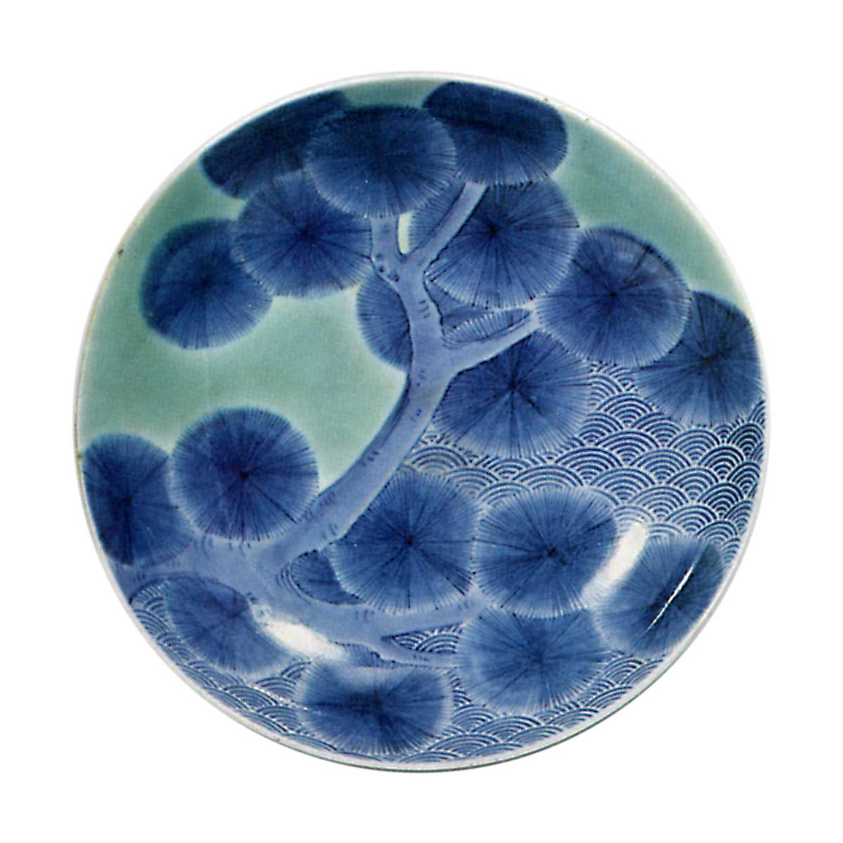 蓝锅岛青瓷染付松纹五寸盘 日本蓝锅岛青瓷染付松纹五寸盘 X Facebook Hatena Bookmark LINE Pinterest 复制 2025.09.26 蓝锅岛青瓷染付松纹五寸盘 高4.3厘米 口径14.8厘米 高台径8.0厘米冈山美术馆此作充分展现了锅岛藩窑引以为傲的完美染付技艺。盘面满布苍翠松树,如此宏大的图案令人难以置信竟出自五寸小盘。余白处施以青瓷釉,烧成色泽略显深沉,但堪称青瓷染付五寸盘中设计最精妙的杰作。盘外侧与主纹呼应,遍布牡丹唐草纹饰,底足饰以梳纹。