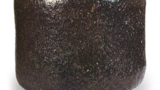 古锅岛猪口器形变化丰富,其设计灵感令人玩味。此猪口采用华头窗造型,器身以簸纹饰朝颜,内口沿至外缘余地施以薄瑠璃釉的釉下彩。牵牛花叶片施以绿色上彩,花瓣则饰以黄色上彩,然绿色釉料流淌晕染与黄色交融,形成大川内窑所未见的粗放上彩技法。双色皆呈浓郁色调乃古锅岛特色,此类猪口皆采用稍厚胎土经模具成型。
