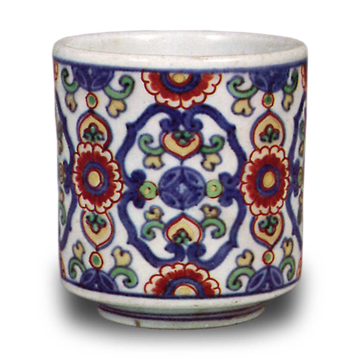 色锅岛彩绘唐草纹猪口 日本色锅岛彩绘唐草纹猪口 X Facebook Hatena Bookmark LINE Pinterest 复制 2025.09.28 色锅岛彩绘唐草纹猪口 高6.7厘米 口径5.9厘米 底径3.9厘米椿繋文 猪口同形猪口。通称更纱纹的八瓣大花与七宝纹为核心的唐草风纹样,遍布器身。此类更纱风纹样常见于古锅岛器,然此猪口上彩发色尤为鲜明。低矮高台饰以青花双线环绕。内壁白釉,器身略厚