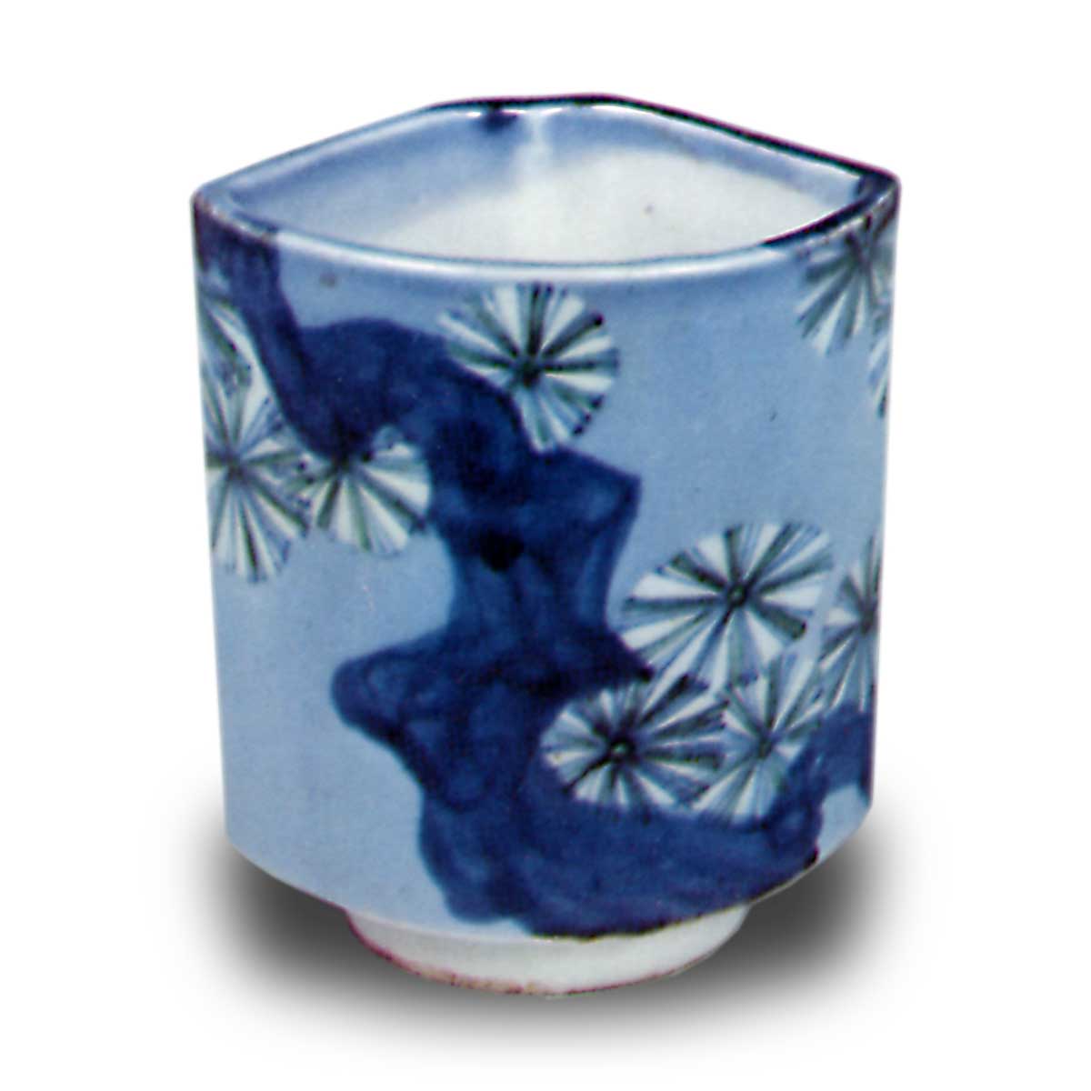 色锅岛彩绘松纹猪口 日本色锅岛彩绘松纹猪口 2025.09.28 色锅岛彩绘松纹猪口 高6.5厘米 口径5.7×4.2厘米 底径3.3厘米这些作品虽被俗称为“松谷烧”,但如前所述,推测应属古锅岛烧范畴。色绘作品均采用青花与彩绘并用的技法,如在浅瑠璃釉地之上以深青花与绿色彩绘表现松树等,器形与纹样皆丰富多样,彩绘色调同样浓重。器形虽为模具成型,但整体厚实,作工相当扎实。这些器物用途应相同,推测为猪口杯。部分器物侧面附有细长管状装饰,另有上绘釉料流淌混杂的案例,制作手法颇为随意,却仍不失格调。